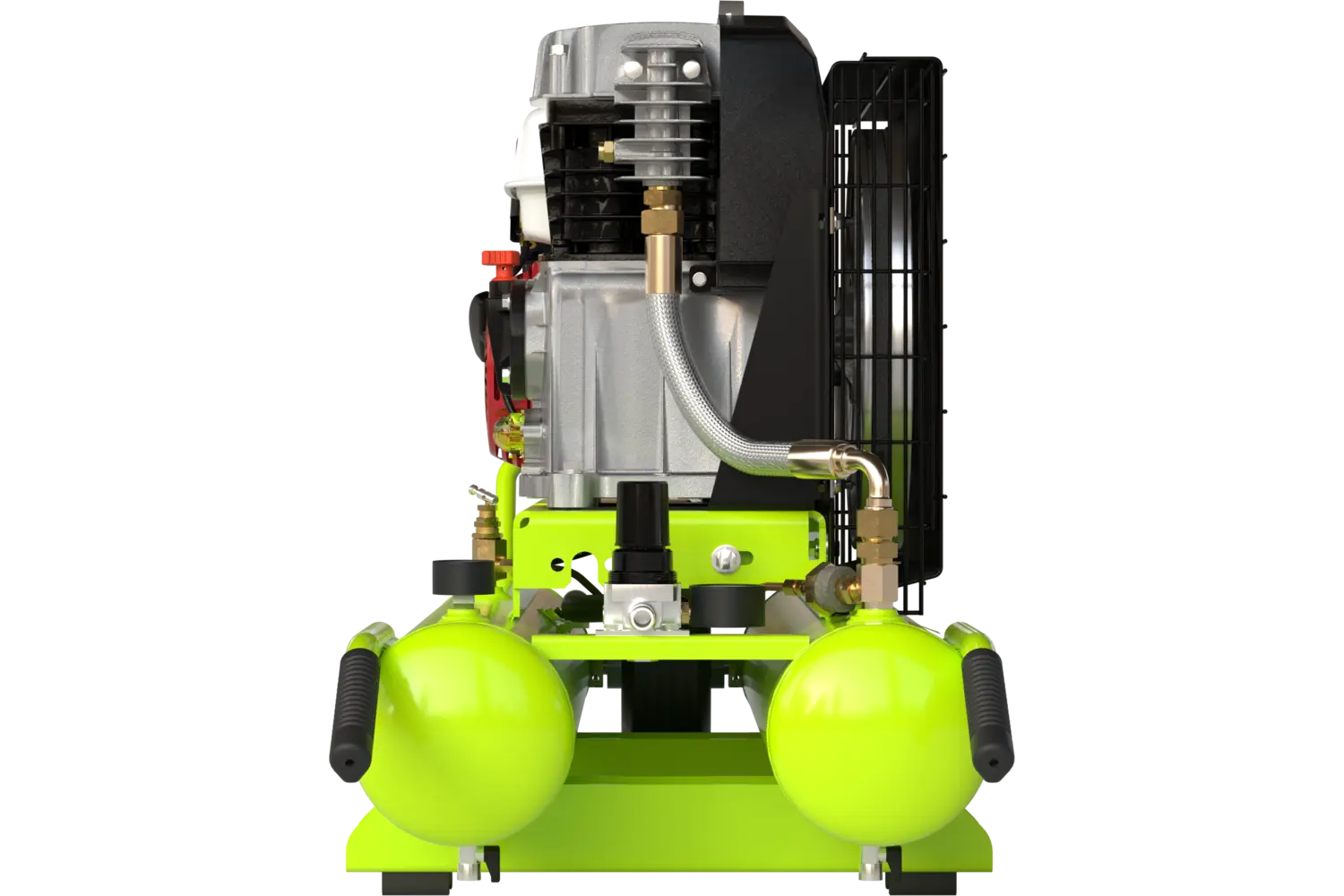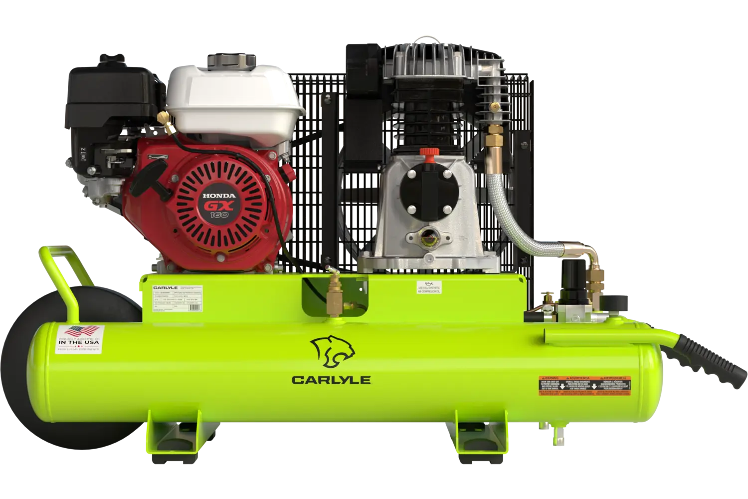 The Carlyle 9 Gallon Gas Air Compressor packs big power into a compact, rugged design, perfect for professionals and serious DIY enthusiasts who need reliable performance on the go. Powered by a robust 5 HP Honda gasoline engine, this single-stage, oil-lubricated compressor delivers 16.3 CFM at 145 PSI, making it ideal for demanding tasks. Built with an Italian-made aluminum alloy pump and cast iron cylinder, it is engineered with oversized bearings to handle heavy use and provide extended service life. An aluminum aftercooler reduces air temperature to optimize air storage in the 9-gallon tank, while the balanced flywheel with an optimized fan blade design ensures smooth operation and improved cooling airflow. Weighing just 143 pounds and measuring 43.7 inches by 16.7 inches by 26.9 inches, this portable powerhouse delivers extremely low oil carryover for cleaner air output and reduced maintenance. Tough, reliable, and built to get the job done, the Carlyle 9 Gallon Gas Air Compressor is ready to handle any challenge you throw its way.