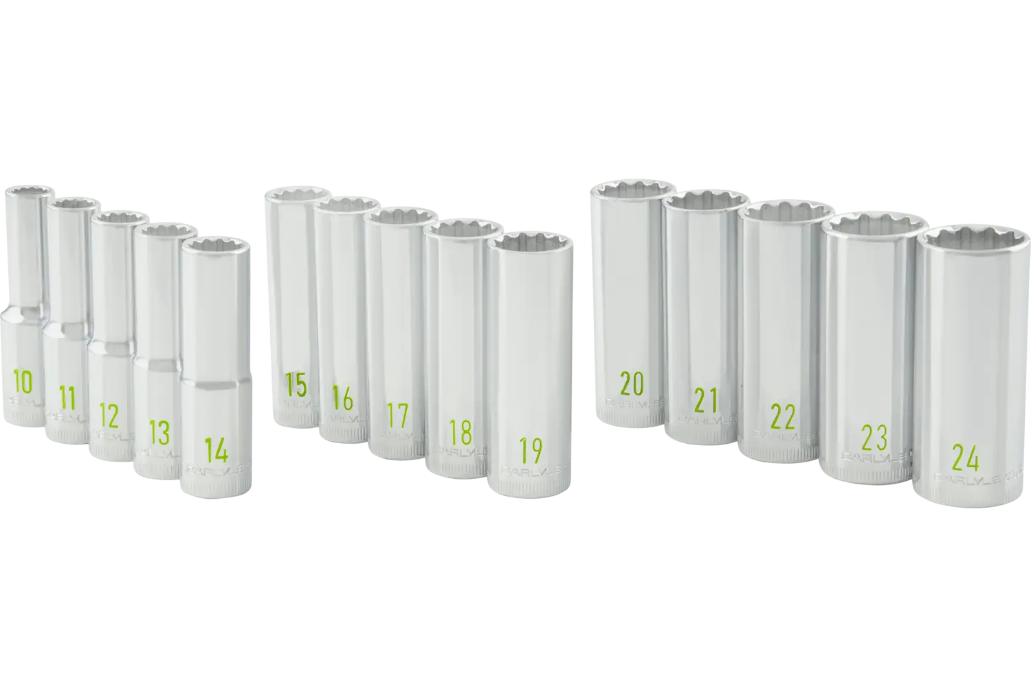 | 10mm, 11mm, 12mm, 13mm, 14mm, 15mm, 16mm, 17mm, 18mm, 19mm, 20mm, 21mm, 22mm, 23mm, 24mm | Chrome | 12 Point | Deep | 15 PC | EVA Foam |