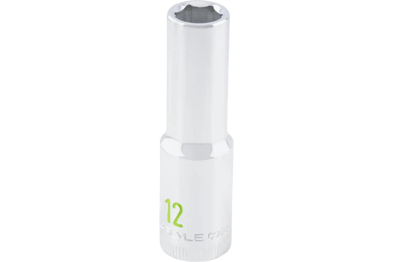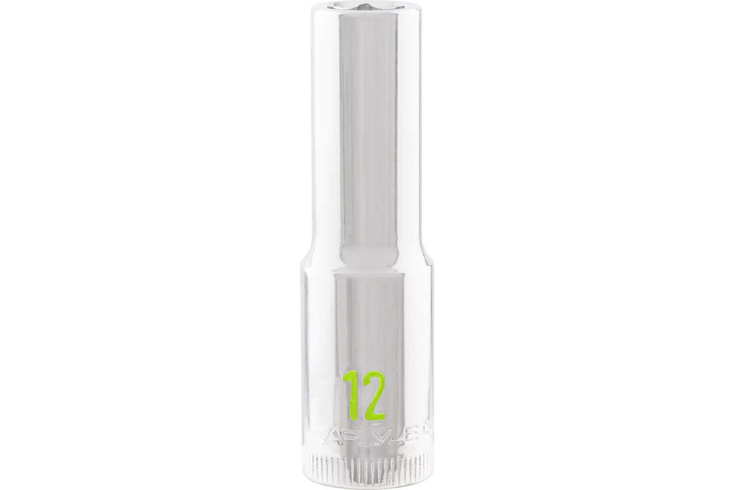 Revamp your toolbox with Carlyle 1/2 in. Drive Deep Chrome Sockets - Metric, designed for those who crave both functionality and flair. Choose between the precision of a 6-point or the versatility of a 12-point design, both engineered to reduce bolt and nut wear while enhancing grip for a flawless performance every time. The full polish chrome finish not only delivers a sleek, eye-catching look but also provides exceptional rust resistance, keeping your tools looking fresh and ready for action. With deep-rolled stamped vertical knurling, identifying the right socket is a breeze, even in the most cluttered toolbox. Available in a wide variety of sizes, these sockets are your go-to for any project, big or small. Get ready to work smarter and shine brighter!