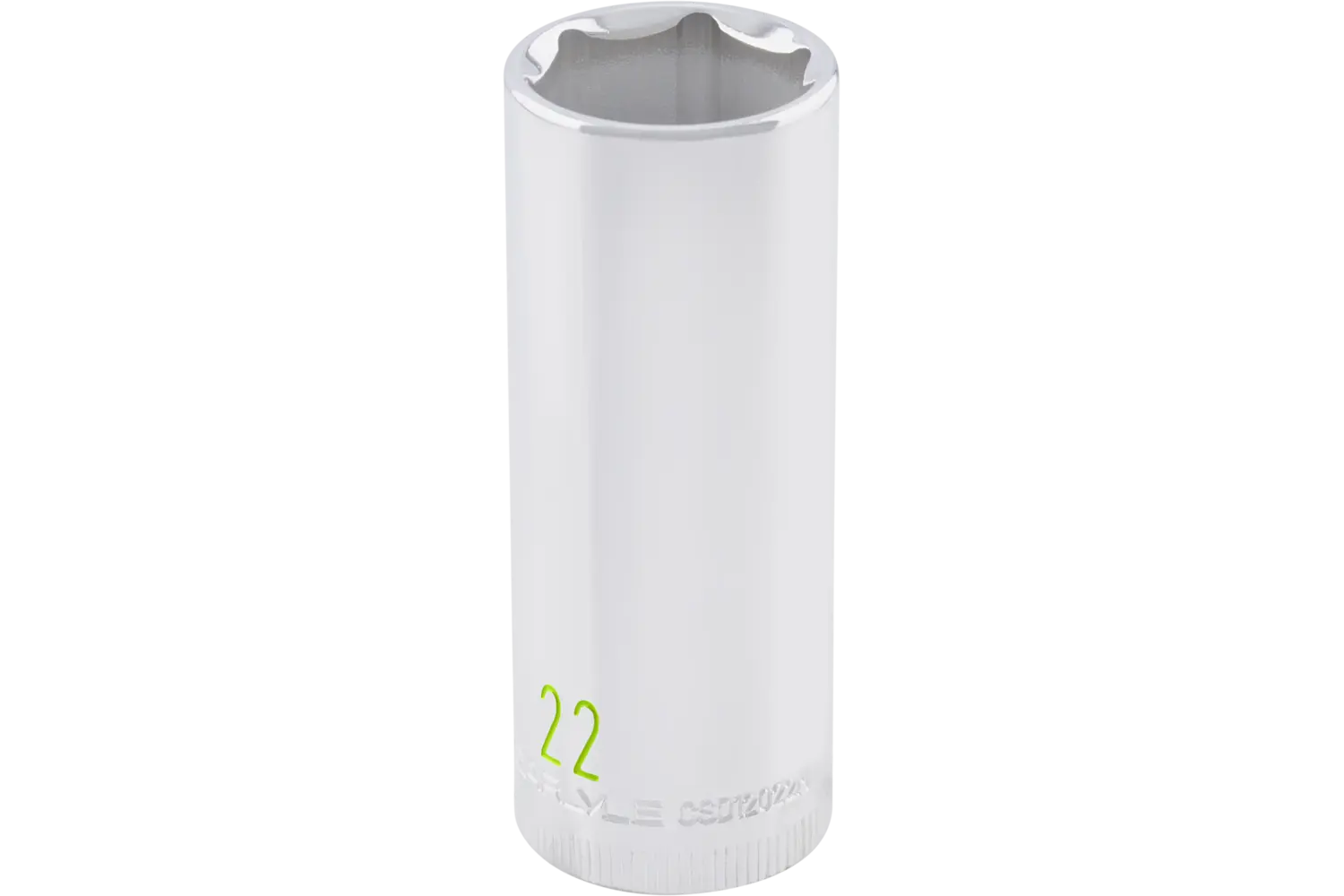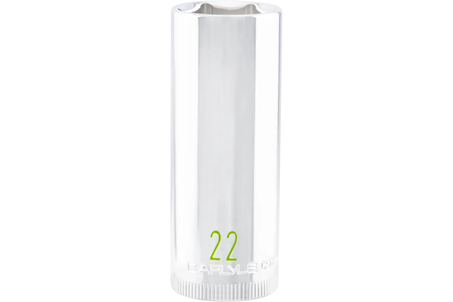 Revamp your toolbox with Carlyle 1/2 in. Drive Deep Chrome Sockets - Metric, designed for those who crave both functionality and flair. Choose between the precision of a 6-point or the versatility of a 12-point design, both engineered to reduce bolt and nut wear while enhancing grip for a flawless performance every time. The full polish chrome finish not only delivers a sleek, eye-catching look but also provides exceptional rust resistance, keeping your tools looking fresh and ready for action. With deep-rolled stamped vertical knurling, identifying the right socket is a breeze, even in the most cluttered toolbox. Available in a wide variety of sizes, these sockets are your go-to for any project, big or small. Get ready to work smarter and shine brighter!
