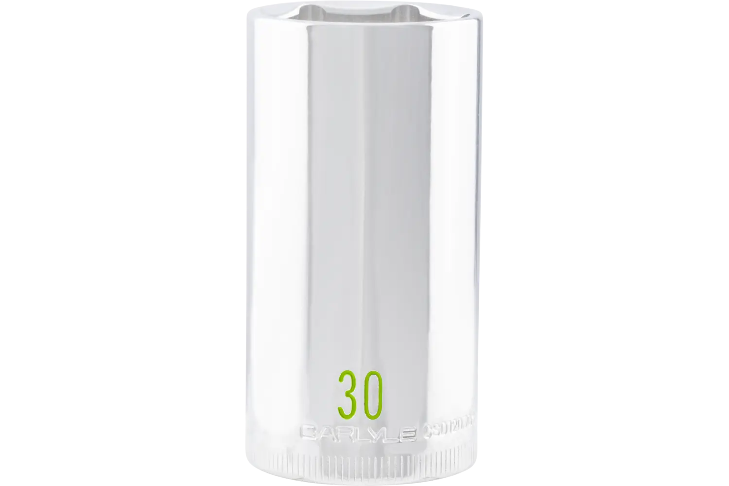 Revamp your toolbox with Carlyle 1/2 in. Drive Deep Chrome Sockets - Metric, designed for those who crave both functionality and flair. Choose between the precision of a 6-point or the versatility of a 12-point design, both engineered to reduce bolt and nut wear while enhancing grip for a flawless performance every time. The full polish chrome finish not only delivers a sleek, eye-catching look but also provides exceptional rust resistance, keeping your tools looking fresh and ready for action. With deep-rolled stamped vertical knurling, identifying the right socket is a breeze, even in the most cluttered toolbox. Available in a wide variety of sizes, these sockets are your go-to for any project, big or small. Get ready to work smarter and shine brighter!