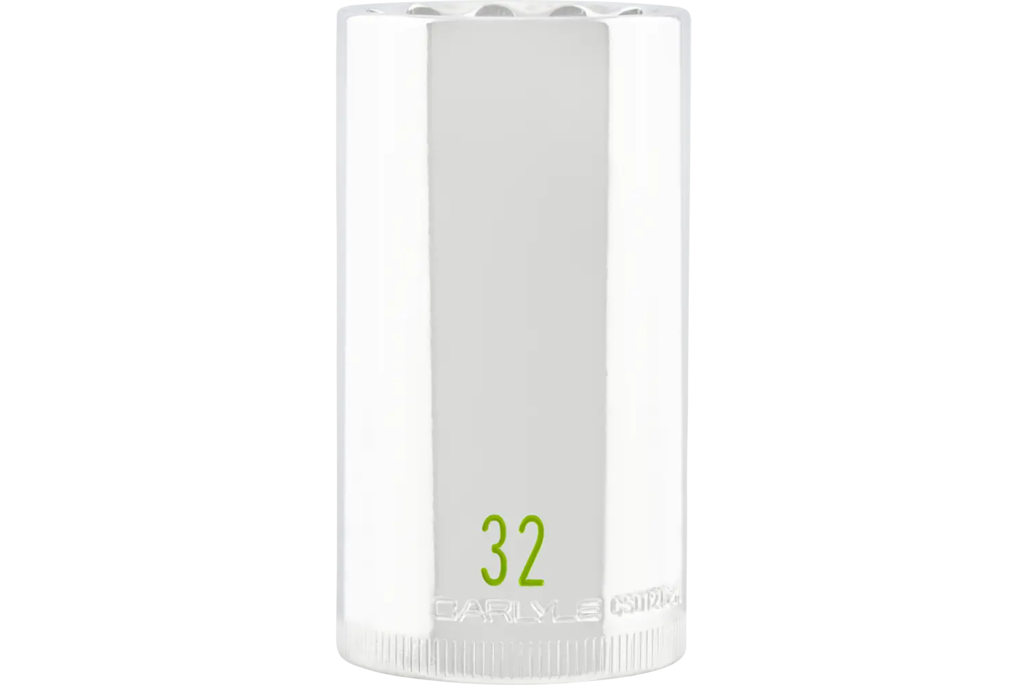 Revamp your toolbox with Carlyle 1/2 in. Drive Deep Chrome Sockets - Metric, designed for those who crave both functionality and flair. Choose between the precision of a 6-point or the versatility of a 12-point design, both engineered to reduce bolt and nut wear while enhancing grip for a flawless performance every time. The full polish chrome finish not only delivers a sleek, eye-catching look but also provides exceptional rust resistance, keeping your tools looking fresh and ready for action. With deep-rolled stamped vertical knurling, identifying the right socket is a breeze, even in the most cluttered toolbox. Available in a wide variety of sizes, these sockets are your go-to for any project, big or small. Get ready to work smarter and shine brighter!