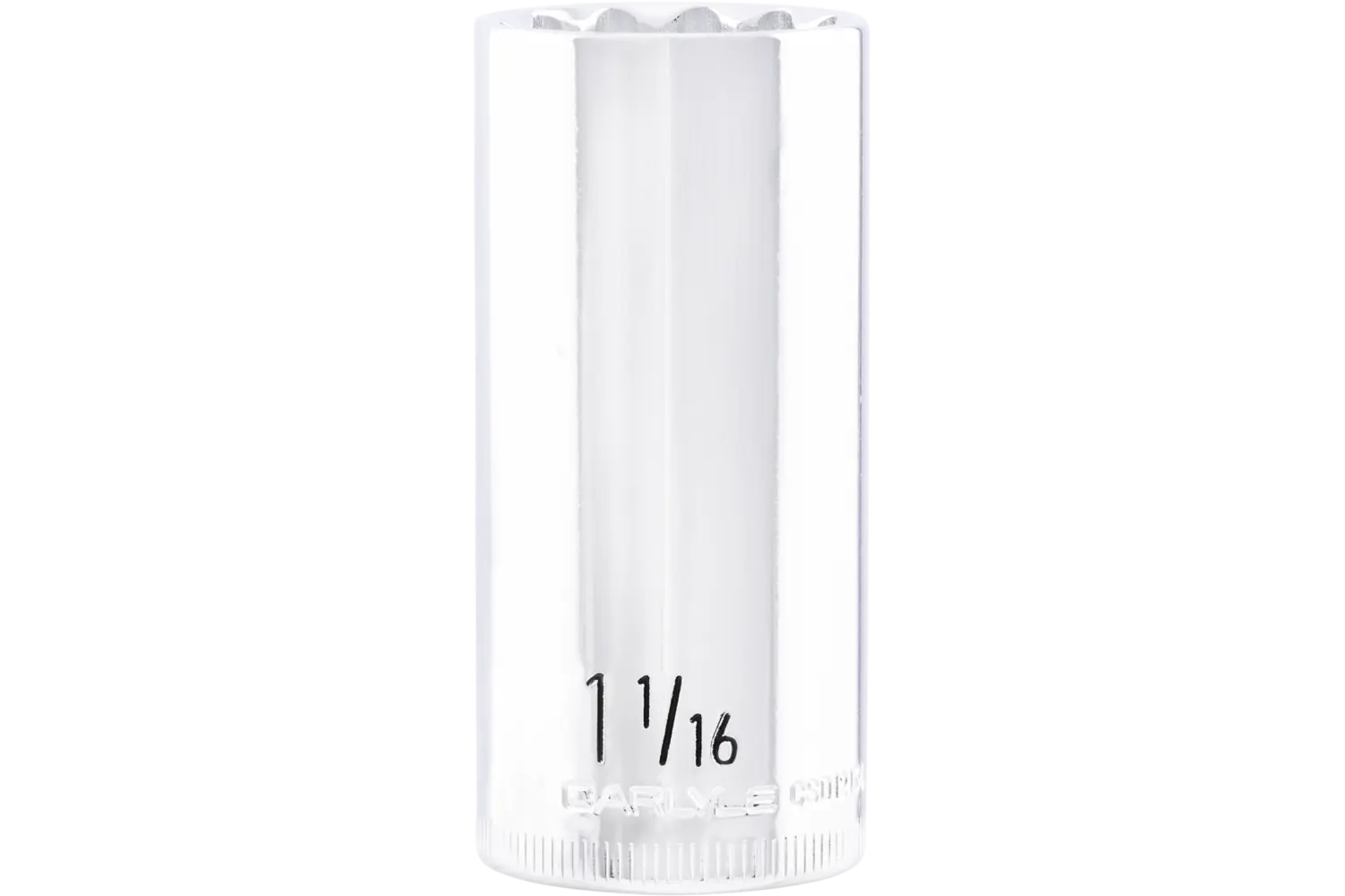 Upgrade your tool collection with Carlyle 1/2 in. Drive Deep Chrome Sockets - SAE, crafted for those who demand both style and substance. Whether you opt for the precision of a 6-point or the flexibility of a 12-point design, these sockets are engineered to minimize bolt and nut wear while maximizing grip, providing every turn is smooth and secure. The full polish chrome finish not only adds a sleek, modern touch but also offers top-notch rust resistance, keeping your tools in prime condition. Thanks to deep-rolled stamped vertical knurling, spotting the right socket is effortless, even in a toolbox full of contenders. Available in a broad range of sizes, these sockets are ready to tackle any task you encounter. Elevate your work, and let your tools do the talking!