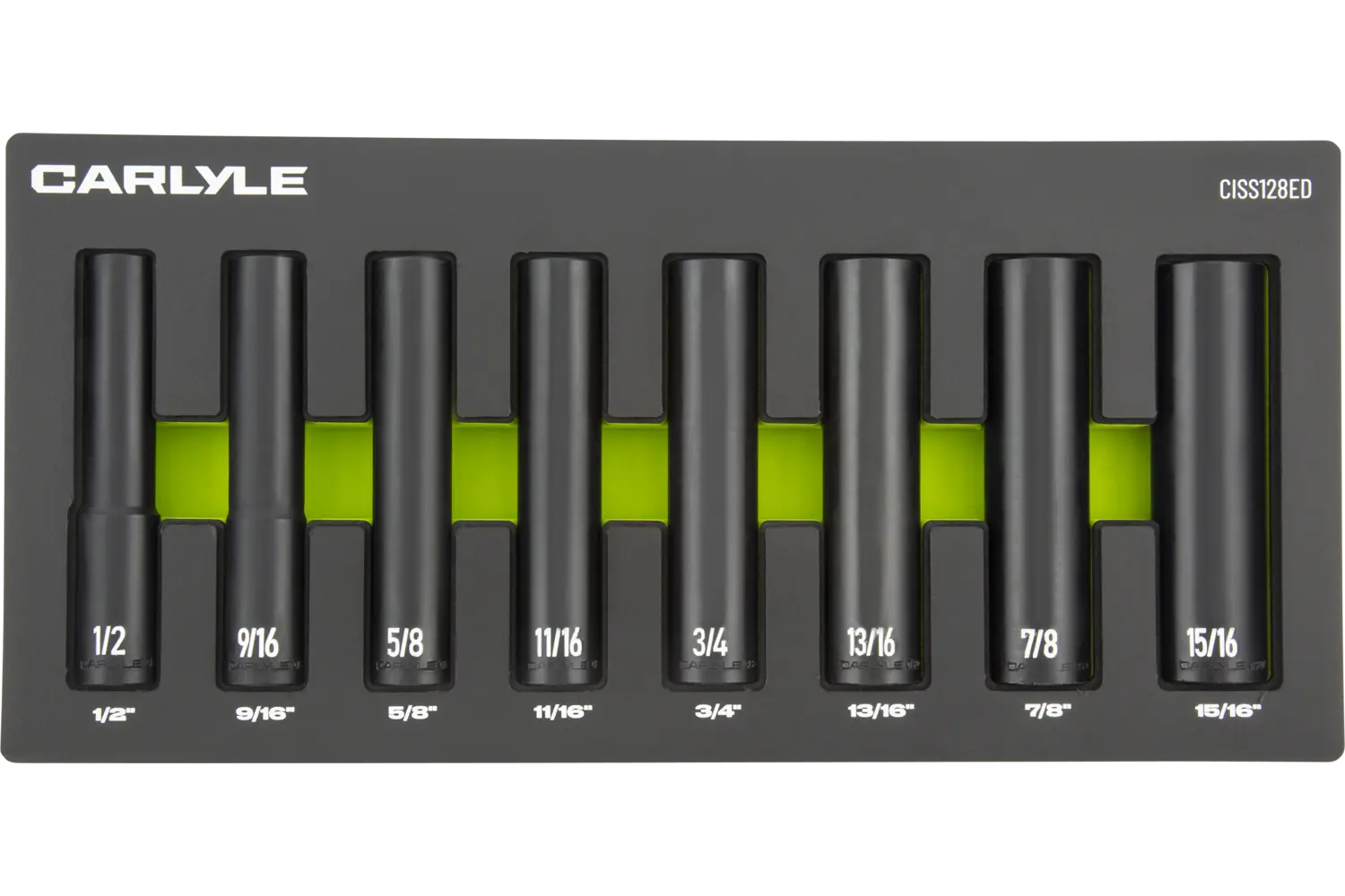 The Carlyle 1/2 in. Drive Deep Impact Socket Set - SAE is engineered for durability and performance, making it an essential tool for demanding applications. Forged from chrome molybdenum alloy steel, these sockets are built to withstand heavy-duty use while delivering consistent performance. The radius corner design offers a secure grip on fasteners, while the chamfered openings allow for quick and seamless connections. Available in multiple configurations, this set includes a plastic storage tray or blow mold case for convenient organization. Built for professionals and DIYers, this set is perfect for tackling tough jobs with confidence.