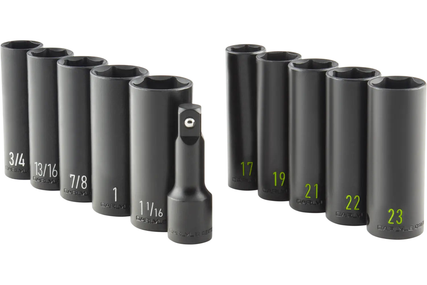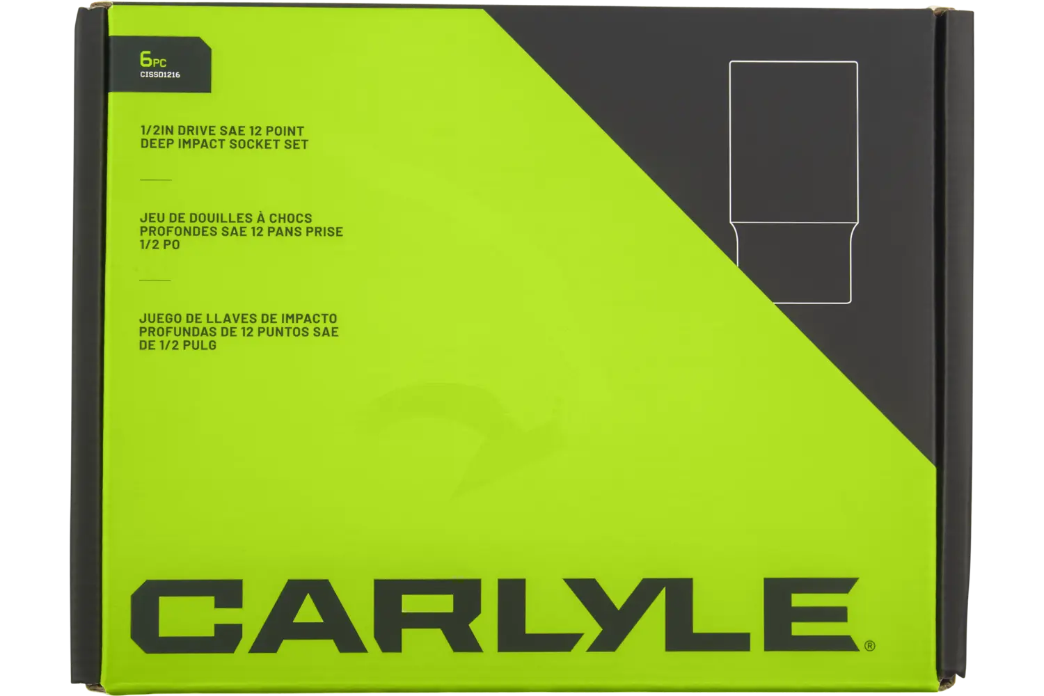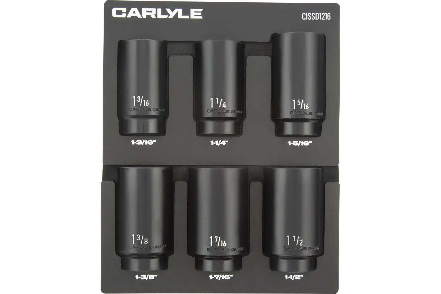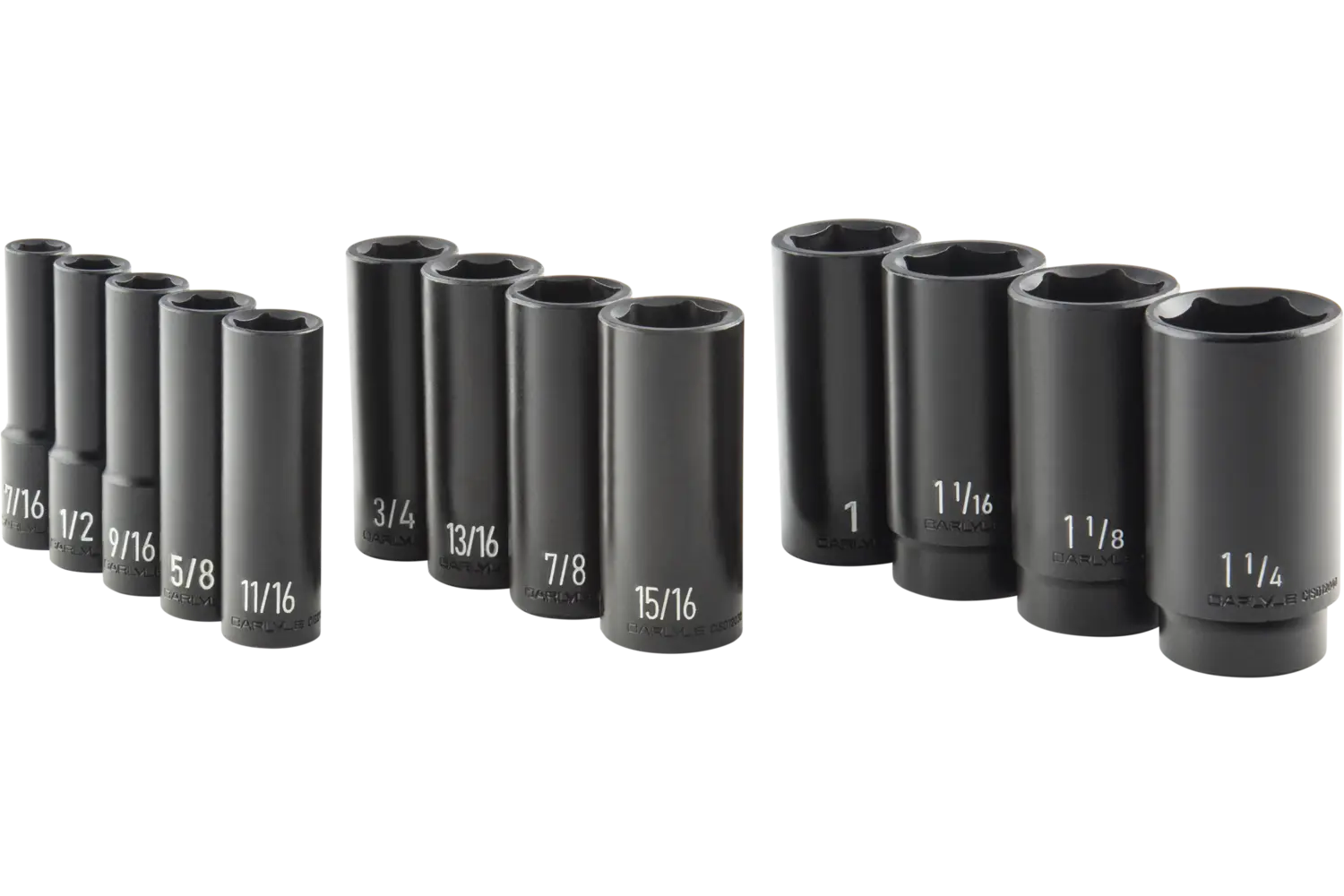 The Carlyle 1/2 in. Drive Deep Impact Socket Set - SAE is engineered for durability and performance, making it an essential tool for demanding applications. Forged from chrome molybdenum alloy steel, these sockets are built to withstand heavy-duty use while delivering consistent performance. The radius corner design offers a secure grip on fasteners, while the chamfered openings allow for quick and seamless connections. Available in multiple configurations, this set includes a plastic storage tray or blow mold case for convenient organization. Built for professionals and DIYers, this set is perfect for tackling tough jobs with confidence.