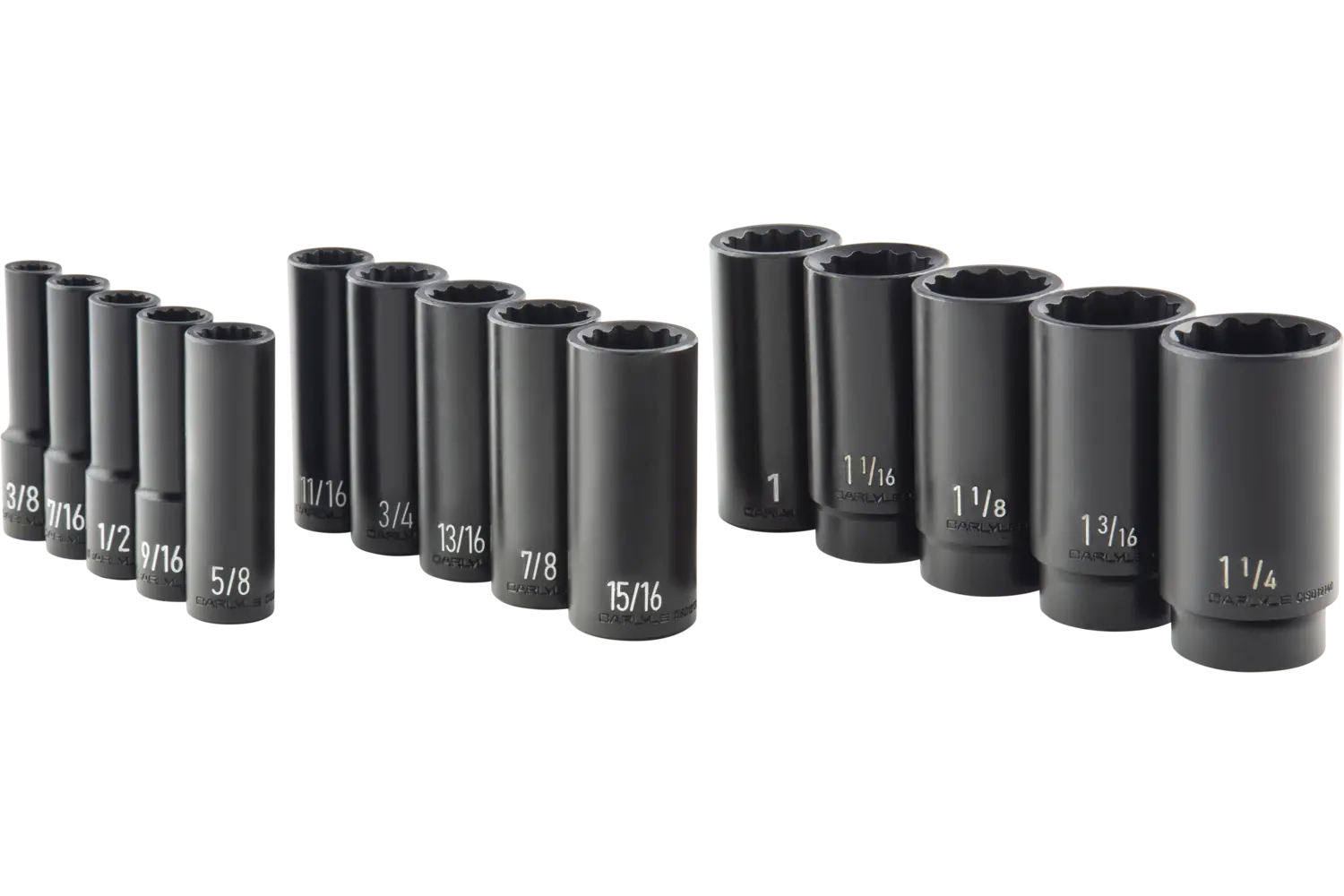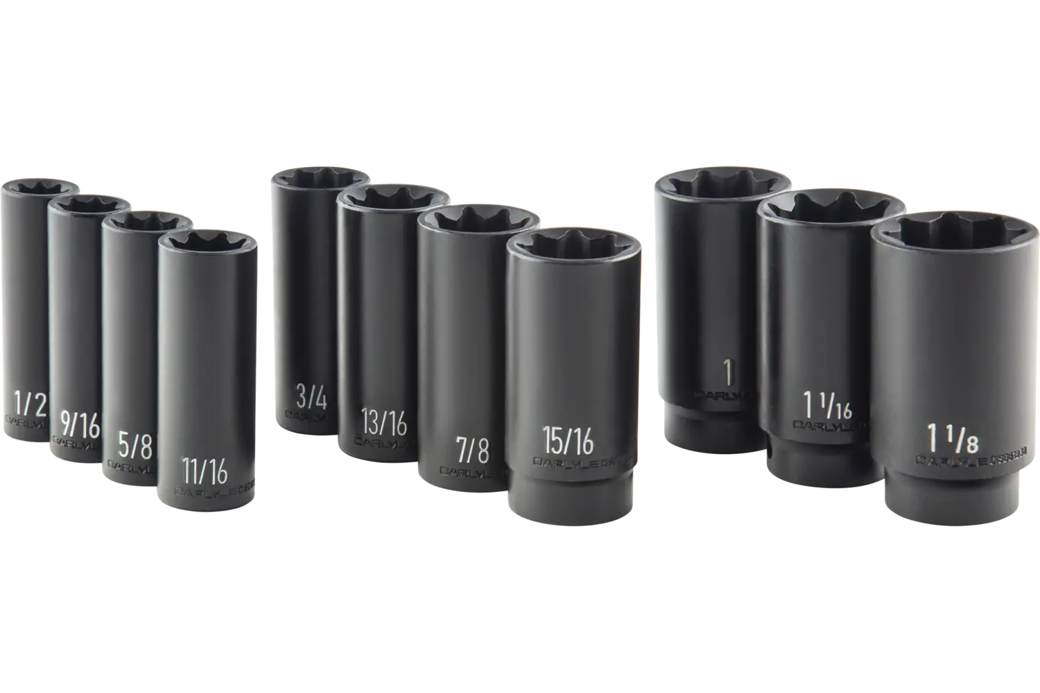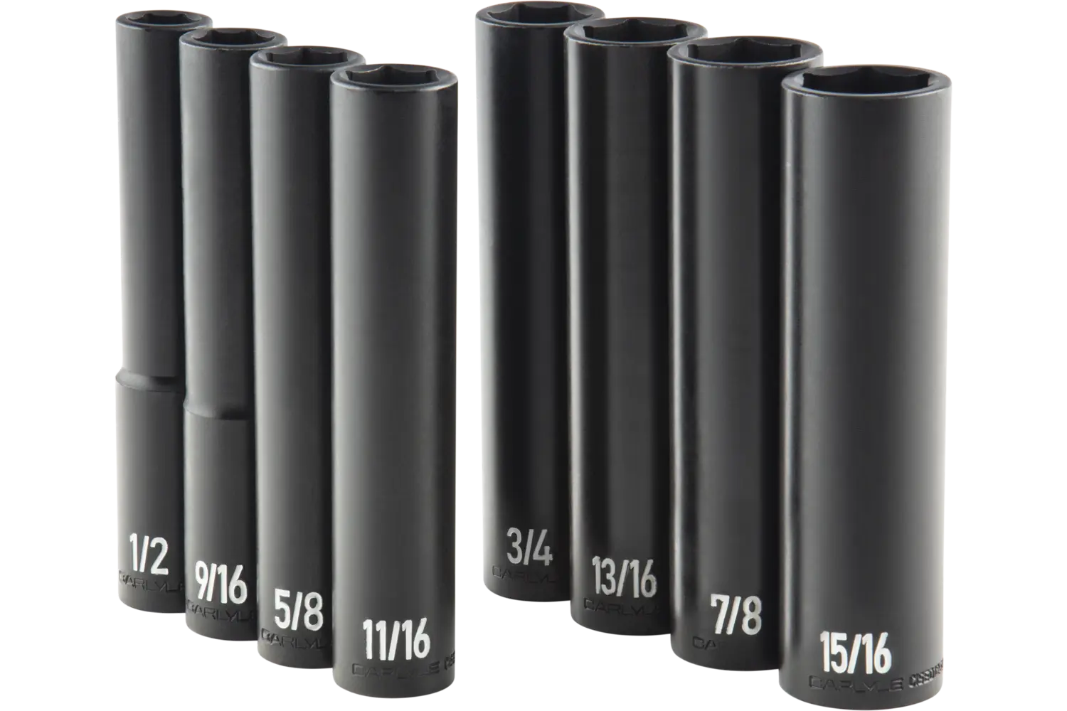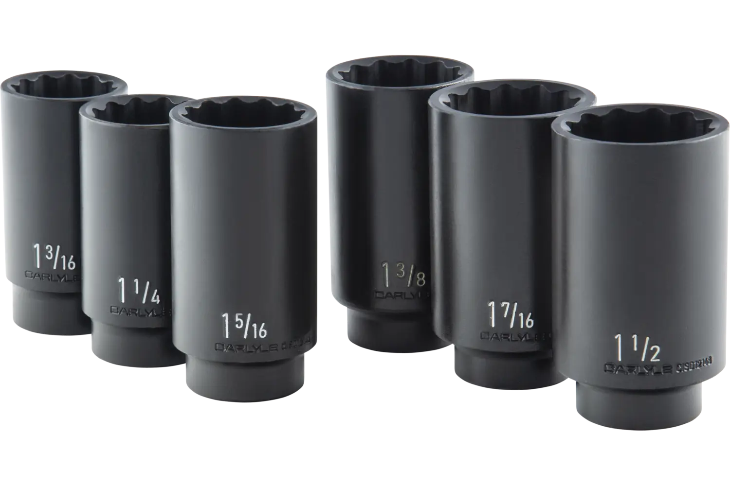 The Carlyle 1/2 in. Drive Deep Impact Socket Set - SAE is engineered for durability and performance, making it an essential tool for demanding applications. Forged from chrome molybdenum alloy steel, these sockets are built to withstand heavy-duty use while delivering consistent performance. The radius corner design offers a secure grip on fasteners, while the chamfered openings allow for quick and seamless connections. Available in multiple configurations, this set includes a plastic storage tray or blow mold case for convenient organization. Built for professionals and DIYers, this set is perfect for tackling tough jobs with confidence.