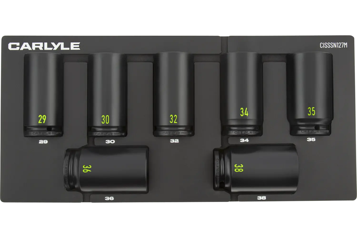The Carlyle 1/2 in. Drive Spindle Nut Socket Set - Metric is built for professionals who demand strength and precision in their tools. Crafted from chrome molybdenum alloy steel, this set is designed to withstand heavy-duty use while delivering consistent performance. The radius corner design offers a secure grip on fasteners, reducing wear and maximizing torque. Chamfered openings allow for quick and easy socket fit, while the set is available in 4-piece or 7-piece configurations. Designed for durability and reliability, this set is perfect for tackling spindle nut applications with confidence.