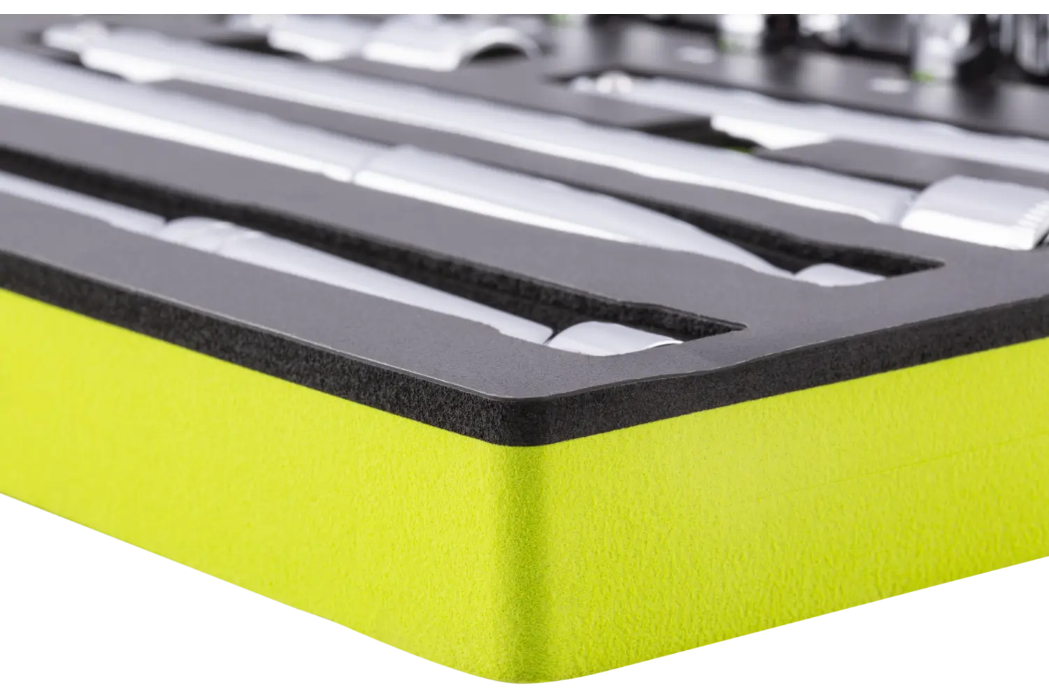 10mm, 11mm, 12mm, 13mm, 14mm, 15mm, 16mm, 17mm, 18mm, 19mm, 20mm, 21mm, 22mm, 23mm, 24mm, 1/2in Drive 90-Tooth Ratchet, 3in Length, 6in Length, 10in Length, 1/2in Drive U-Joint, 1/2in Drive 15in Breaker Bar Chrome 12 Point Standard 21 PC EVA Foam