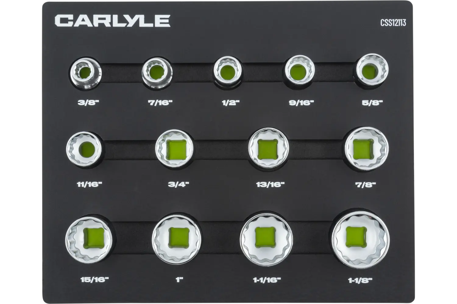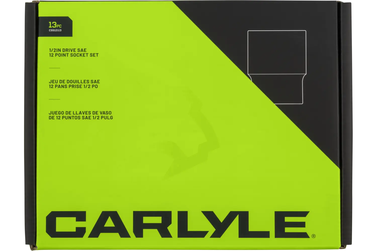 Built to take on tough jobs with style and precision, the Carlyle 1/2 in. Drive Standard Depth Chrome Socket Set - SAE delivers the durability and versatility pros and DIYers demand. Featuring a radius-cornered 12-point socket design, it provides better fastener control and reduces wear, while the highly polished chrome-plated finish fights off rust to keep your tools looking sharp. Whether you choose the 6, 13, or 20-piece set, each includes a teardrop ratchet, extensions, and a universal joint to tackle any job with ease. The 20-piece set comes in a rugged blow-molded case for maximum portability, while the smaller sets include a convenient socket rail for streamlined storage. Tough, reliable, and built to perform, this set is ready to handle whatever the job throws your way.