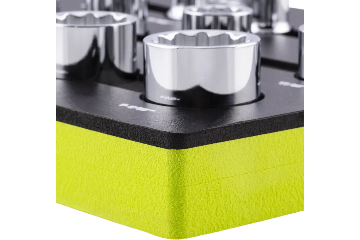 7/16in, 1/2in, 9/16in, 5/8in, 11/16in, 3/4in, 13/16in, 7/8in, 15/16in, 1in, 1-1/16in, 1-1/8in, 1-3/16in, 1-1/4in, 1/2in Drive 90-Tooth Ratchet, 3in Length, 6in Length, 10in Length, 1/2in Drive U-Joint, 1/2in Drive 15in Breaker Bar Chrome 12 Point Standard 20 PC EVA Foam
