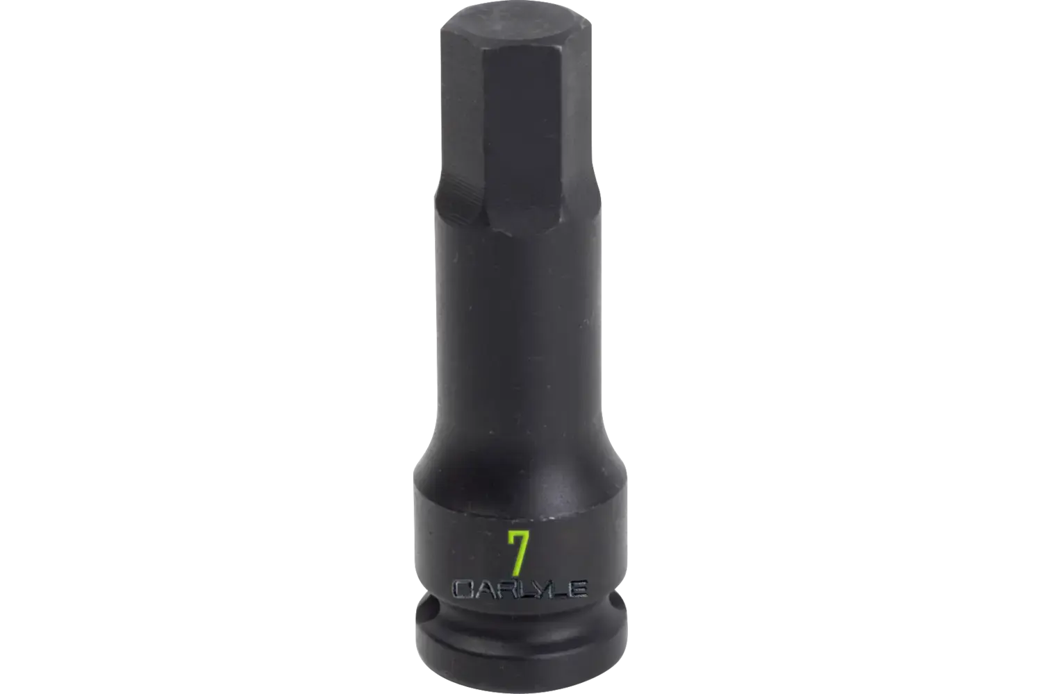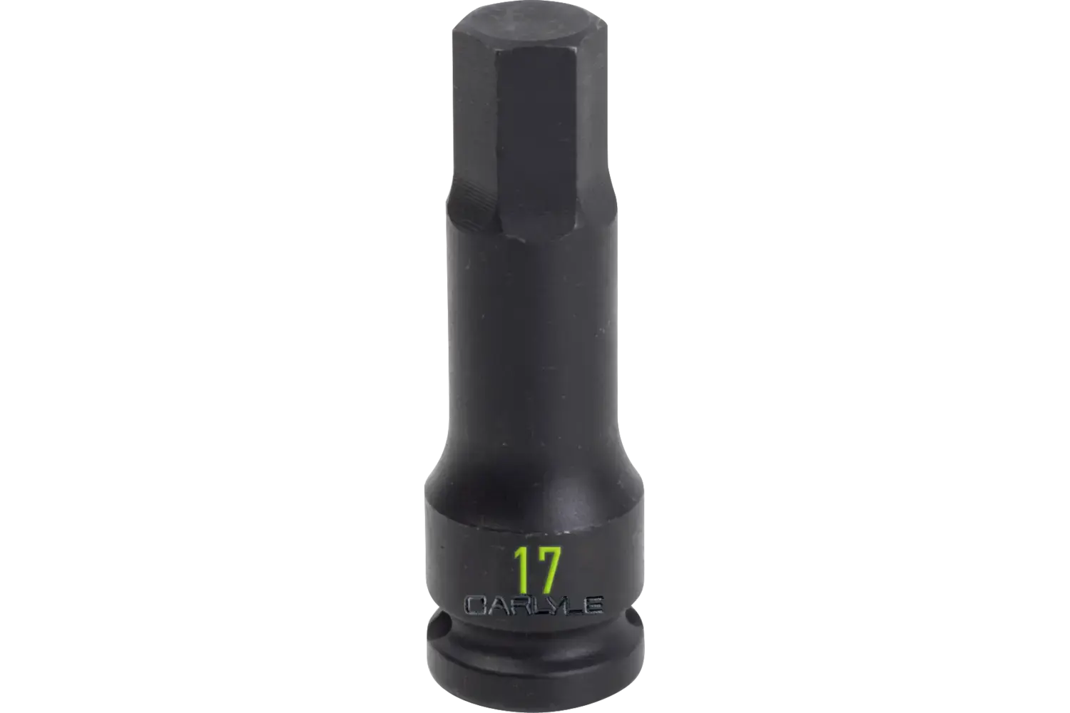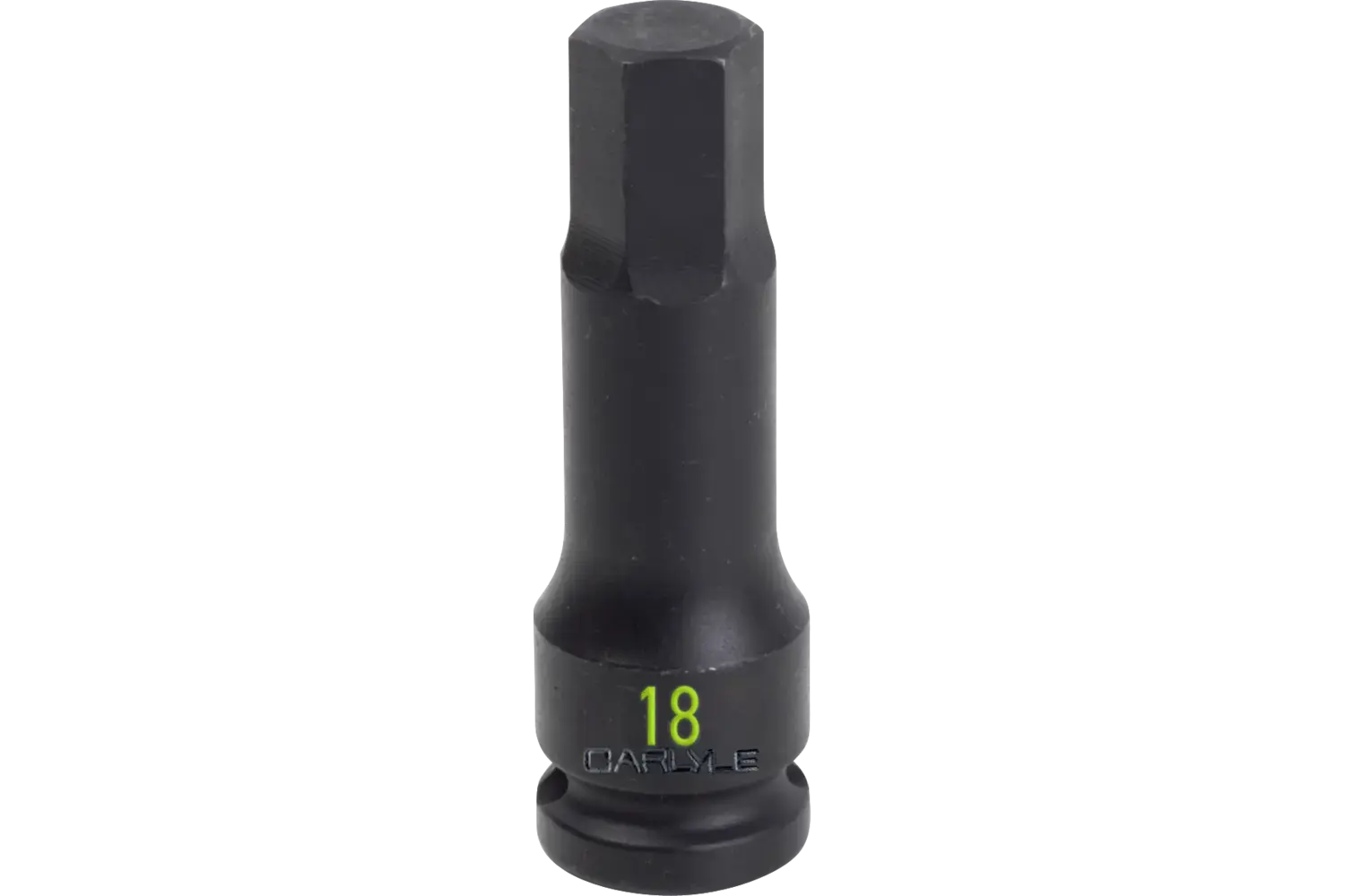 The Carlyle 1/2 in. Drive Standard Depth Hex Bit Impact Socket - Metric is built to handle the toughest jobs with precision and durability. Designed with a radius corner on the working end, it grips fasteners more effectively, reducing wear and tear. The chamfered drive opening allows for a smooth and secure connection between the socket and your drive tool, making every job more efficient. Crafted from Chrome Molybdenum Alloy Steel, this socket delivers unmatched strength and durability, while the black phosphate finish fights off corrosion for long-lasting performance. Perfect for use with impact power or air tools, it's available in a wide variety of sizes to tackle any project with confidence and style.