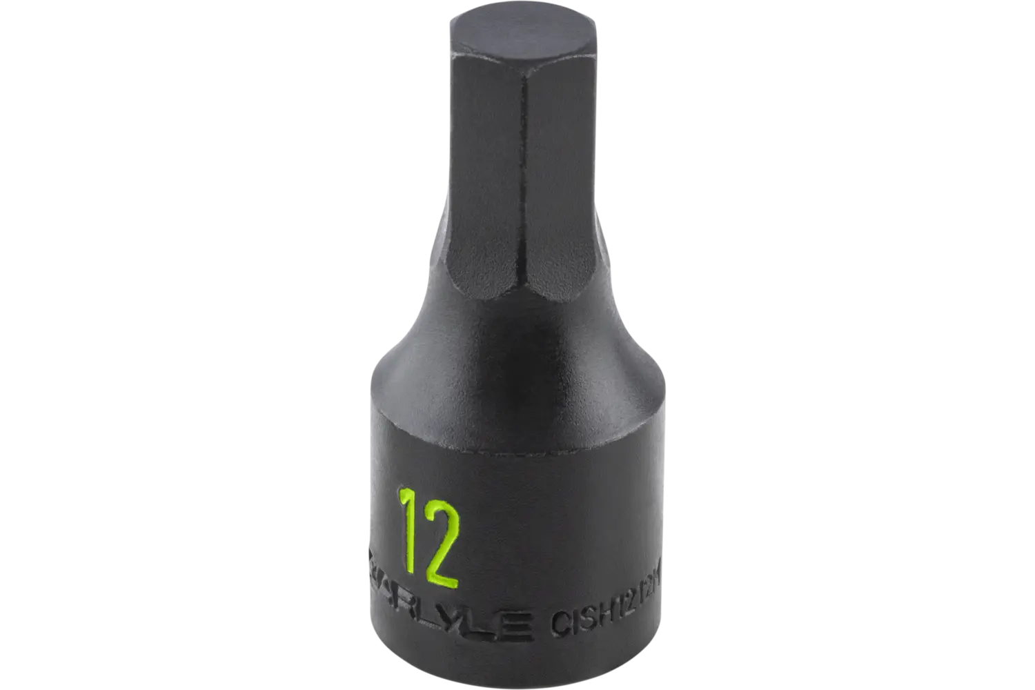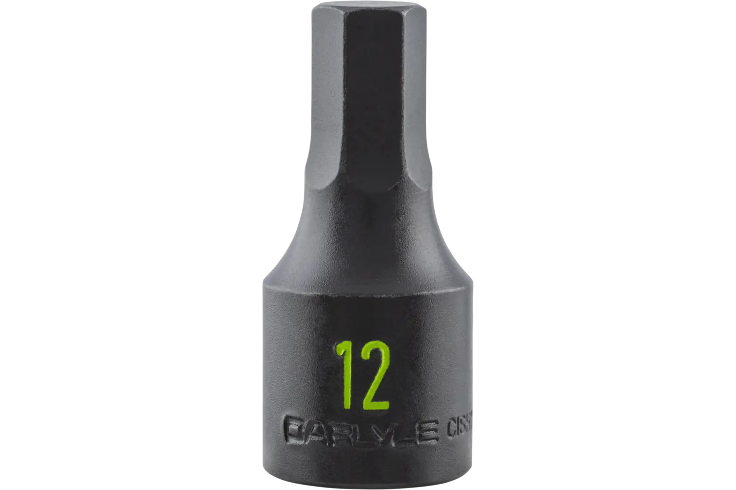 The Carlyle 1/2 in. Drive Standard Depth Hex Bit Impact Socket - Metric is built to handle the toughest jobs with precision and durability. Designed with a radius corner on the working end, it grips fasteners more effectively, reducing wear and tear. The chamfered drive opening allows for a smooth and secure connection between the socket and your drive tool, making every job more efficient. Crafted from Chrome Molybdenum Alloy Steel, this socket delivers unmatched strength and durability, while the black phosphate finish fights off corrosion for long-lasting performance. Perfect for use with impact power or air tools, it's available in a wide variety of sizes to tackle any project with confidence and style.