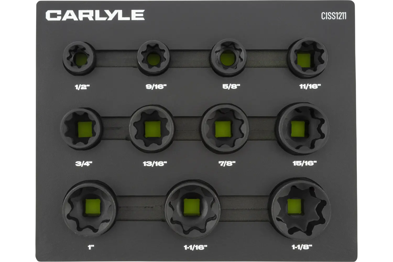The Carlyle 1/2 in. Drive Standard Depth Impact Socket Set - SAE is built for strength and reliability, making it an essential tool for demanding tasks. Crafted from chrome molybdenum alloy steel, these sockets are designed to deliver maximum torque and long-lasting performance. The radius corner design offers a secure grip on fasteners, while the chamfered openings allow for quick and seamless connections. Available in multiple configurations, this set comes with a convenient plastic storage tray for easy organization. Perfect for professionals and DIYers, this set is built to handle tough jobs with confidence.
