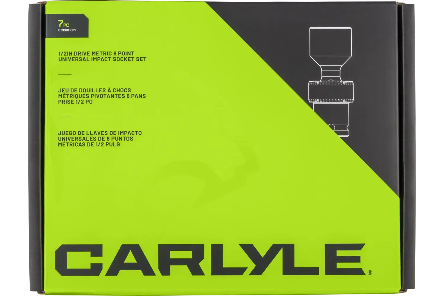 The Carlyle 1/2 in. Drive Universal Swivel Standard Depth Impact Socket Set - Metric is built to handle tough jobs with precision and power. Forged from high-quality chrome molybdenum alloy steel, this 7-piece set is designed for maximum strength and durability, ready to take on the demands of impact tools. Featuring a radius corner design for superior gripping on fasteners and chamfered openings for faster, smoother socket fit, it's all about getting the job done efficiently. Complete with a durable plastic storage tray, this set is the perfect combination of rugged performance and smart design, built for pros and hardcore DIYers who demand reliability.