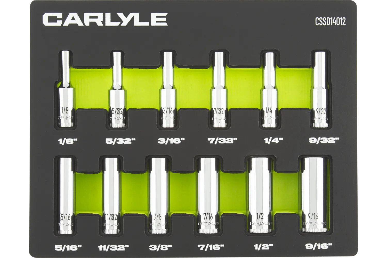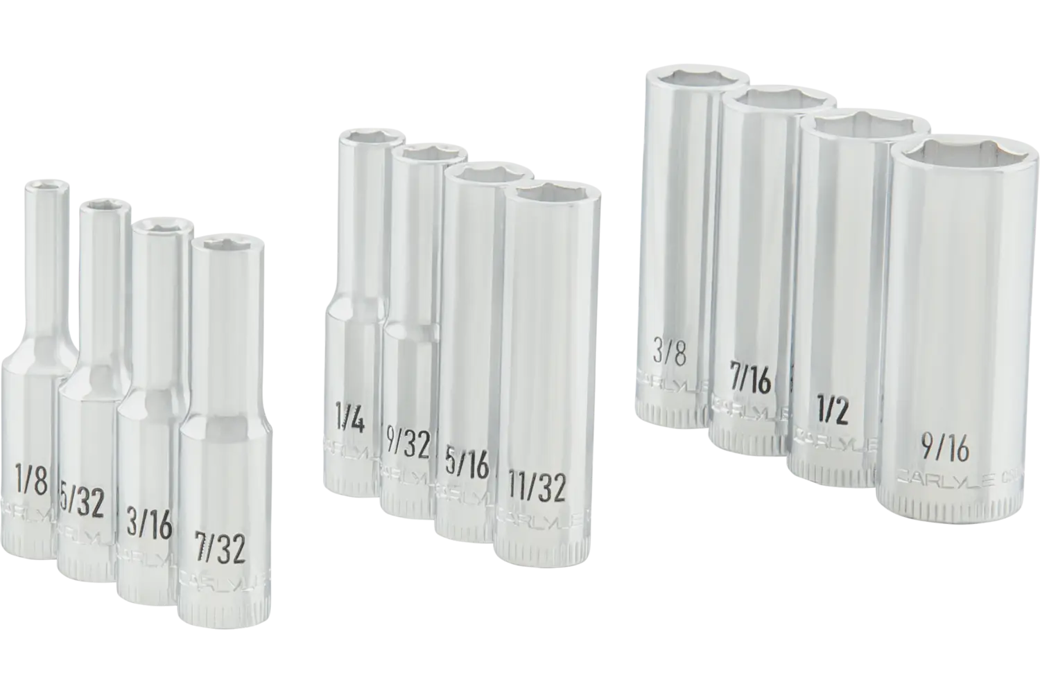 Harness the precision of the Carlyle 1/4 in. Drive Deep Chrome Socket Set - SAE, a durable and versatile solution for automotive and mechanical work. These deep sockets feature a high-polish chrome finish that resists rust and wear, providing long-lasting performance. Designed to maximize torque by shifting contact points to the flats of fasteners, they reduce wear and prevent rounding or stripping. With deep-rolled stamped markings for easy identification, this set is built for efficiency and reliability. A practical choice for professionals and DIY enthusiasts, these sockets are crafted for demanding tasks.