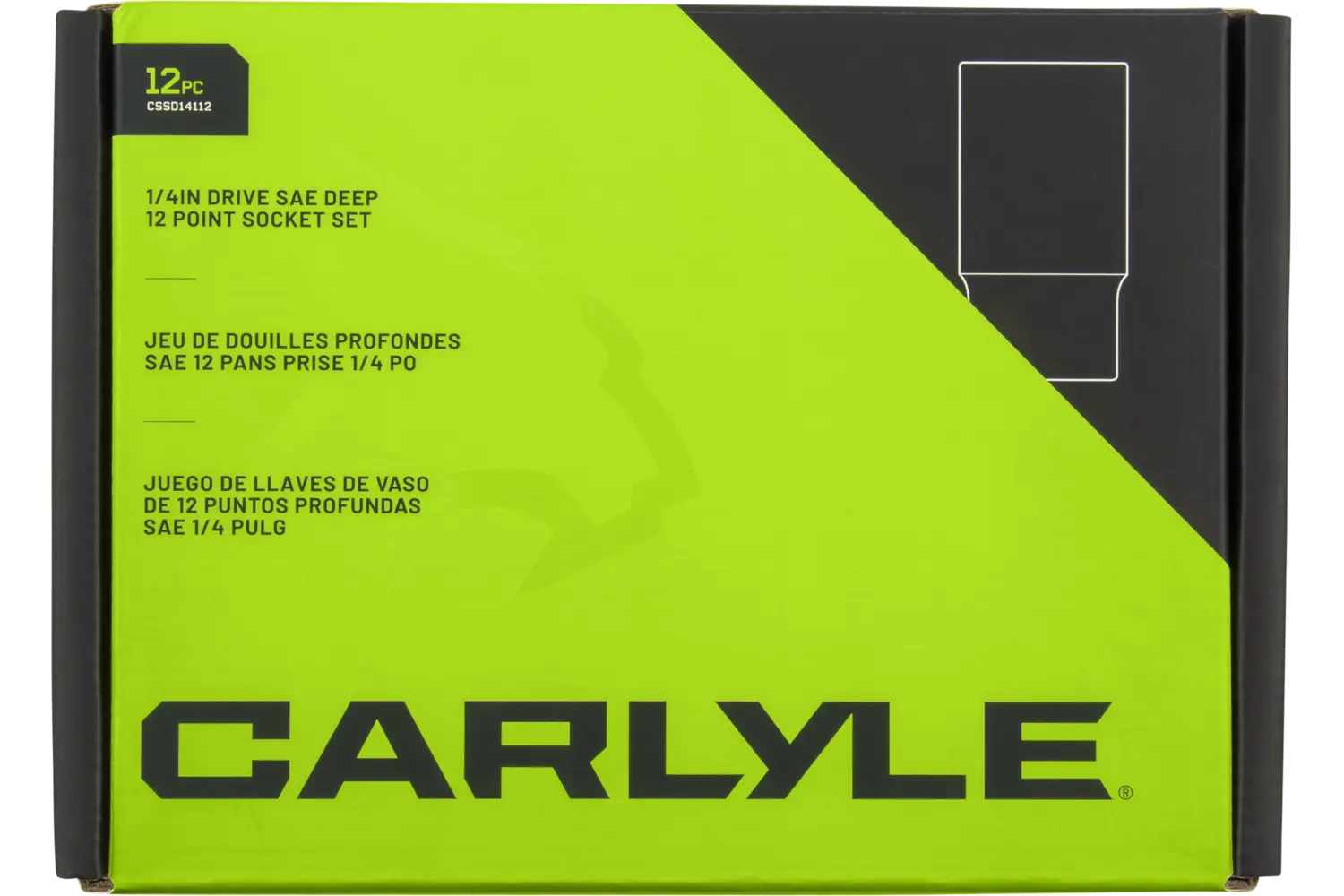 Harness the precision of the Carlyle 1/4 in. Drive Deep Chrome Socket Set - SAE, a durable and versatile solution for automotive and mechanical work. These deep sockets feature a high-polish chrome finish that resists rust and wear, providing long-lasting performance. Designed to maximize torque by shifting contact points to the flats of fasteners, they reduce wear and prevent rounding or stripping. With deep-rolled stamped markings for easy identification, this set is built for efficiency and reliability. A practical choice for professionals and DIY enthusiasts, these sockets are crafted for demanding tasks.