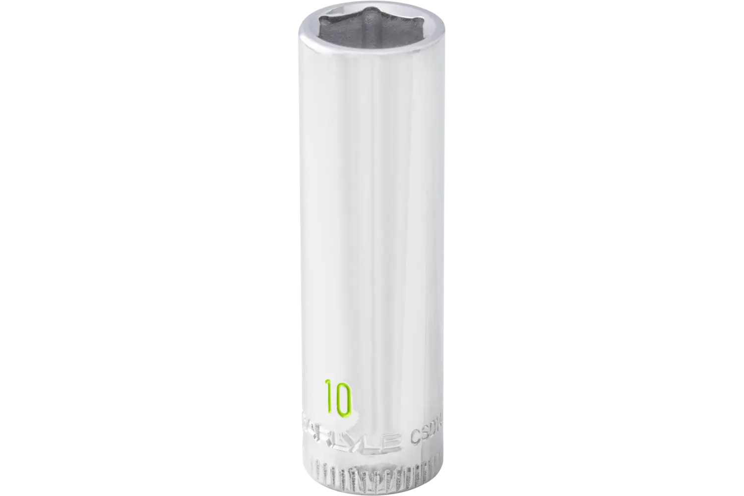 The Carlyle 1/4" Drive Deep Socket - Metric is a durable and precise tool for automotive tasks. Its 6-point design reduces wear on bolts and nuts while improving grip. The chrome finish resists rust, and the knurled markings make identification easy. Available in a range of sizes, this socket is a reliable choice for both professionals and DIY enthusiasts.