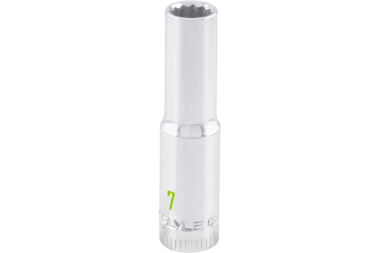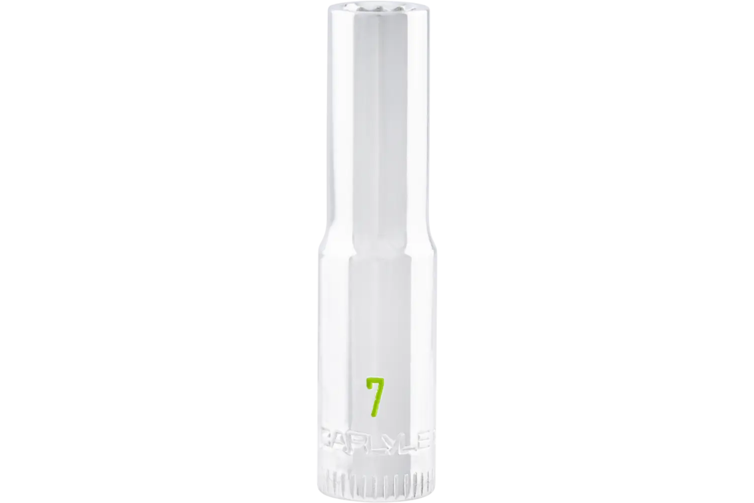 The Carlyle 1/4" Drive Deep Socket - Metric is a durable and precise tool for automotive tasks. Its 6-point design reduces wear on bolts and nuts while improving grip. The chrome finish resists rust, and the knurled markings make identification easy. Available in a range of sizes, this socket is a reliable choice for both professionals and DIY enthusiasts.