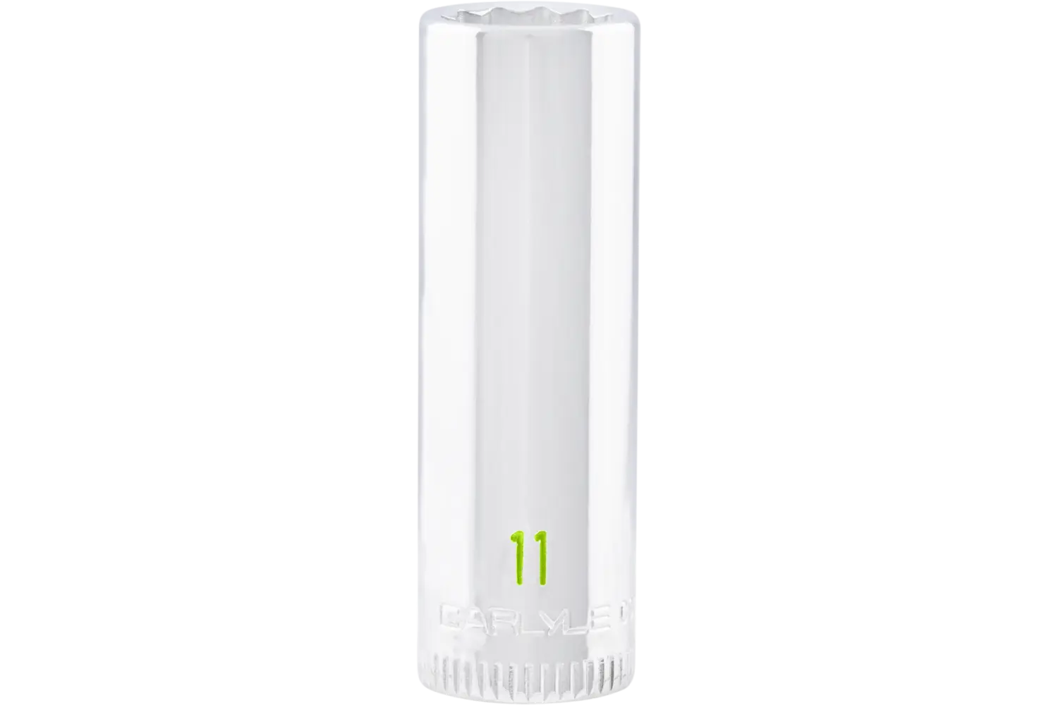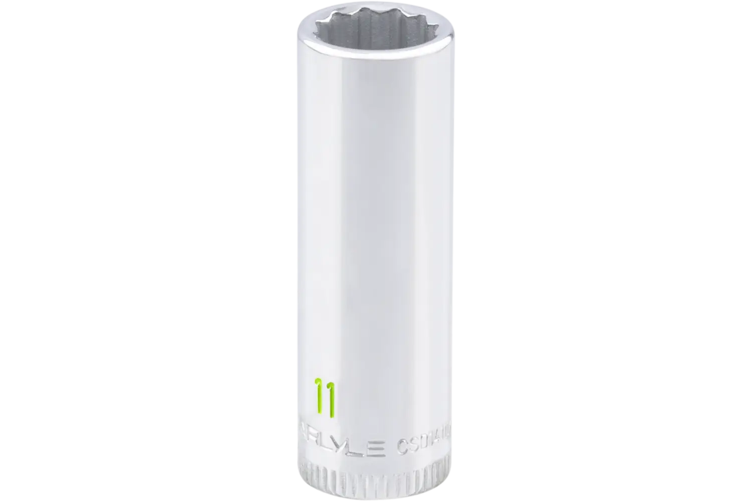 The Carlyle 1/4" Drive Deep Socket - Metric is a durable and precise tool for automotive tasks. Its 6-point design reduces wear on bolts and nuts while improving grip. The chrome finish resists rust, and the knurled markings make identification easy. Available in a range of sizes, this socket is a reliable choice for both professionals and DIY enthusiasts.