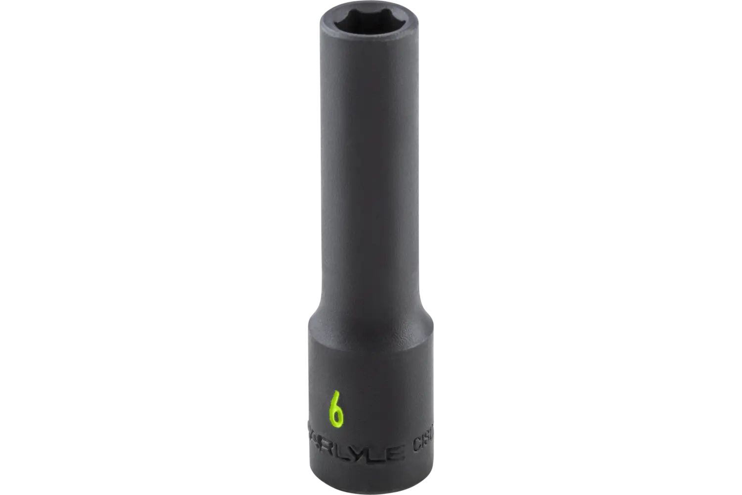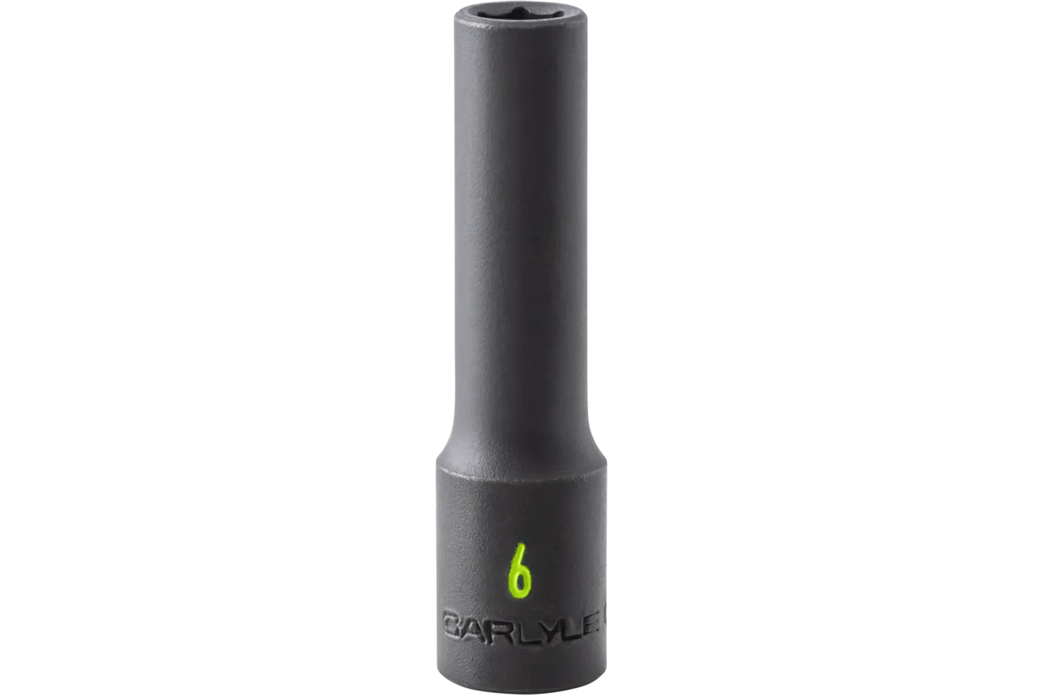 The Carlyle Tools 1/4" Drive 6 Pt. Deep Impact Socket is a durable tool for use with impact power tools. Its 6-point design enhances grip and reduces fastener wear, while the black phosphate finish provides corrosion resistance. Crafted from robust materials, this socket is built for tough tasks and is a valuable addition to any toolkit.