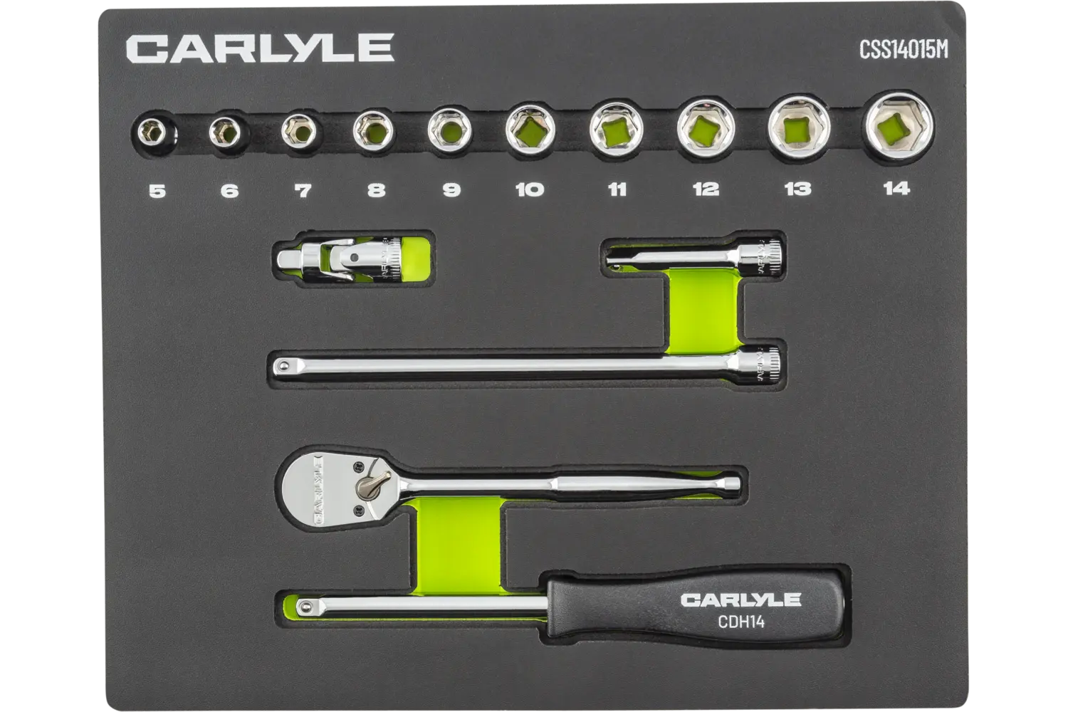 | 5mm, 6mm, 7mm, 8mm, 9mm, 10mm, 11mm, 12mm, 13mm, 14mm, 1/4in Drive 90-Tooth Ratchet, 1/4in Drive Driver Handle, 2in Length, 6in Length, 1/4in Drive U-Joint | Chrome | 6 Point | Standard | 15 PC | EVA Foam | |