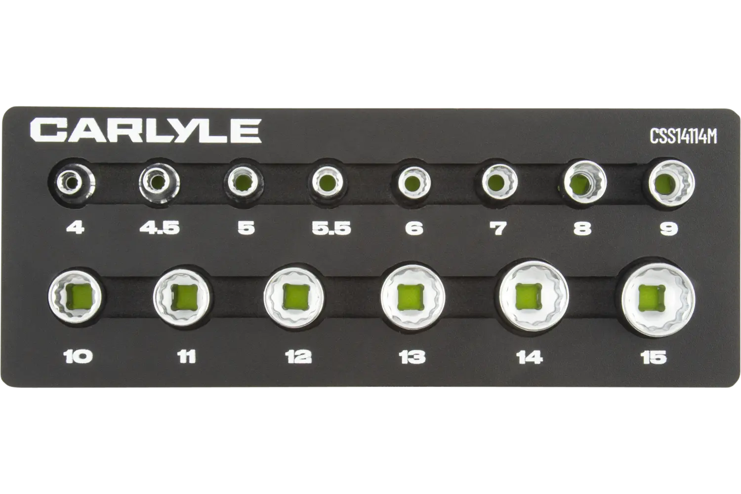 The Carlyle 1/4 in. Drive Standard Depth Chrome Socket Set - Metric is a versatile and durable collection for tackling demanding tasks. Featuring a high-polish chrome finish for rust resistance, these sockets are designed to provide maximum torque while reducing wear. The advanced design prevents rounding or stripping, providing reliable performance. With clear markings and a convenient socket rail for organization, this set is a practical choice for professionals and DIY enthusiasts alike.