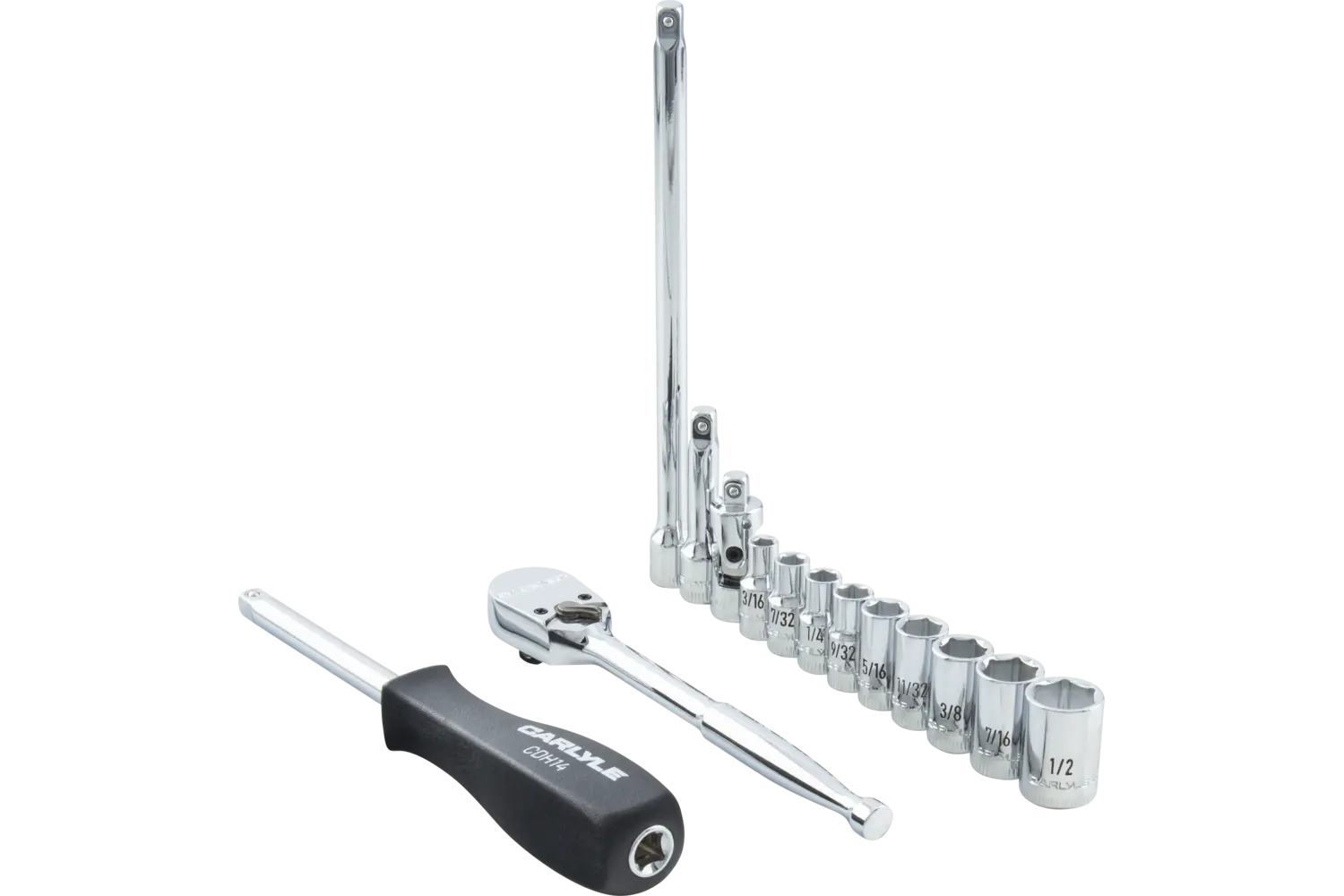 Behold the Carlyle 1/4 in. Drive Standard Depth Chrome Socket Tool Set, a 14-piece collection engineered for strength and precision. Crafted from durable steel and alloy, these sockets feature a high-polish chrome finish that resists rust and wear. The advanced design transfers torque to the flats of fasteners, reducing wear and preventing rounding. With clear markings for easy identification and a convenient socket rail for organization, this set is a practical addition to any professional or DIY toolkit.