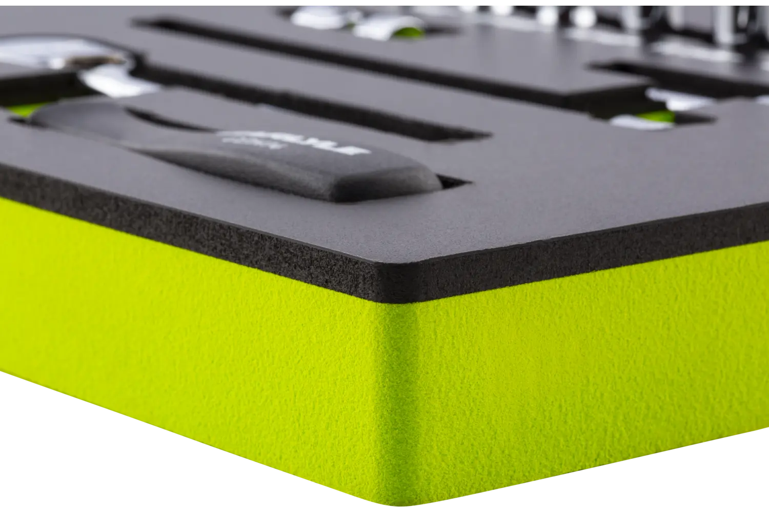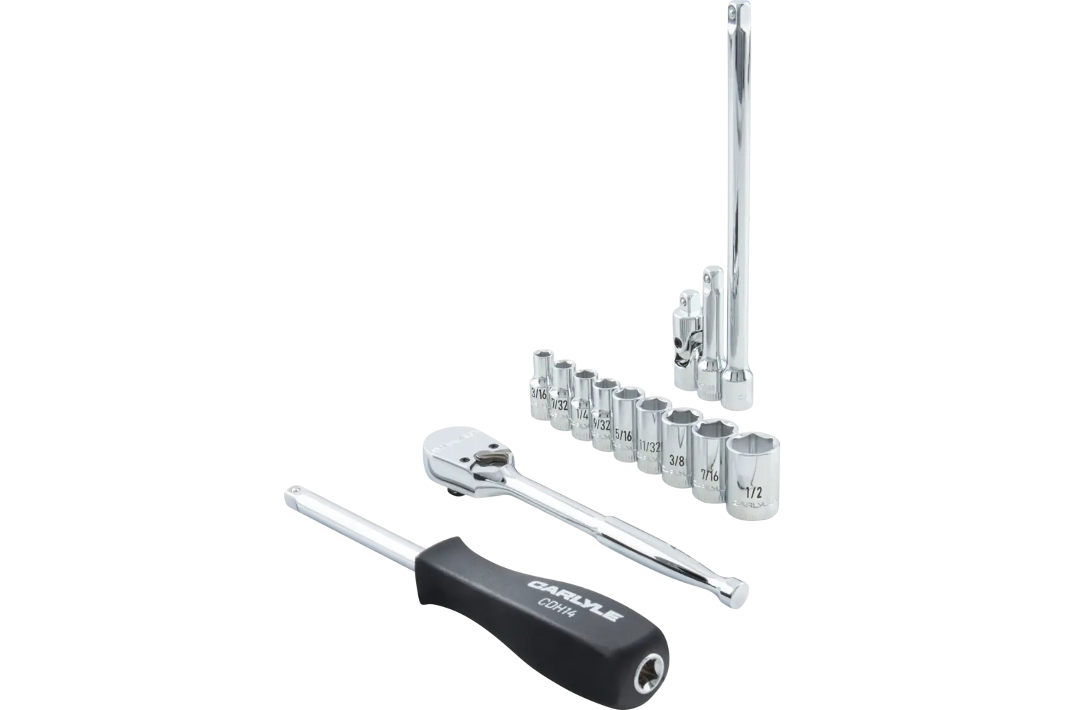 3/16in, 7/32in, 1/4in, 9/32in, 5/16in, 11/32in, 3/8in, 7/16in, 1/2in, 1/4in Drive 90-Tooth Ratchet, 1/4in Drive Driver Handle, 2in Length, 6in Length, 1/4in Drive U-Joint Chrome 6 Point Standard 14 PC EVA Foam