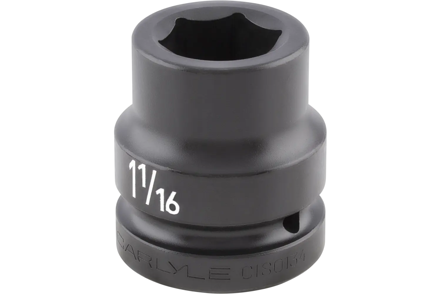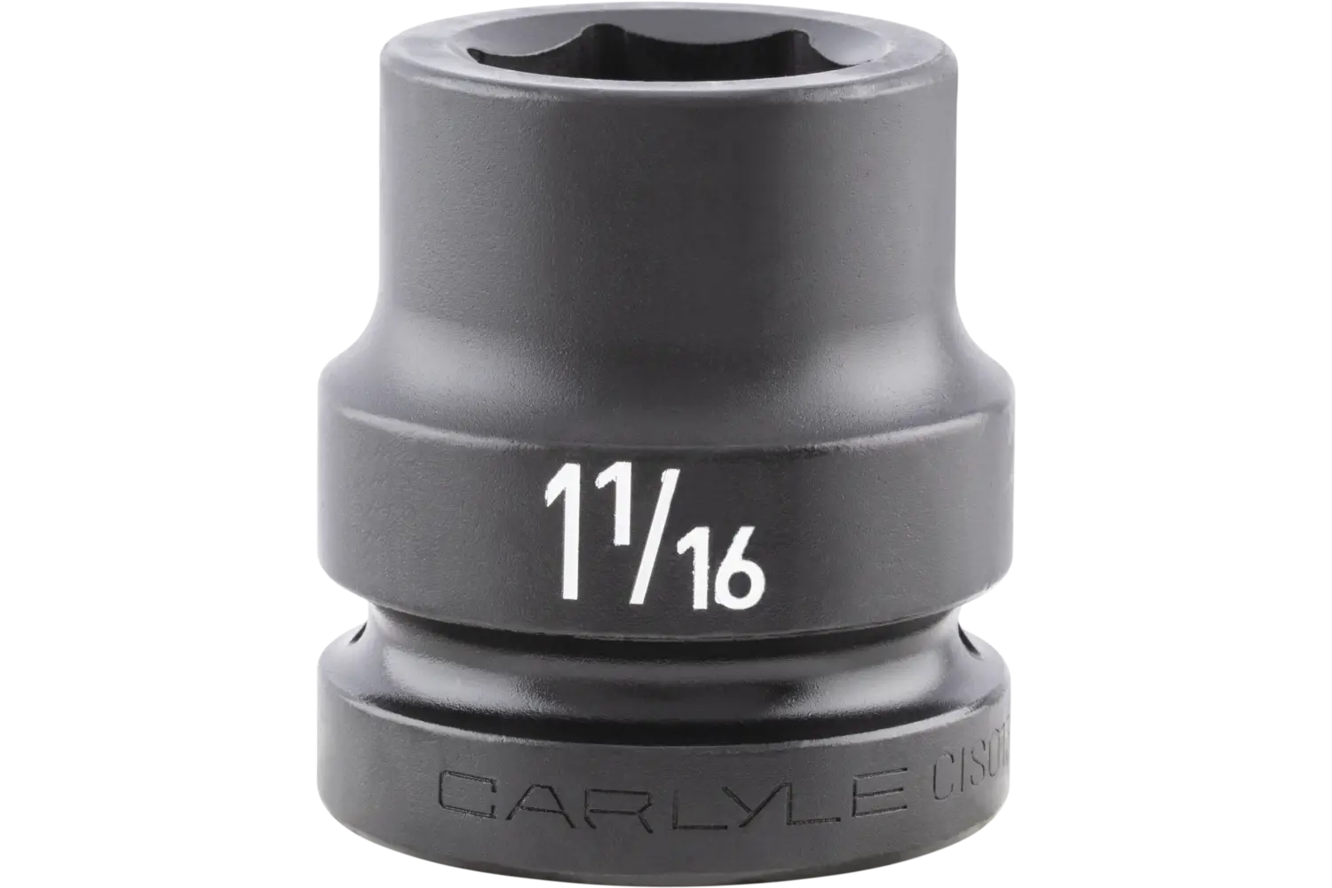 The Carlyle 1 in. Drive Standard Depth Impact Sockets - SAE are reliable tools for automotive and industrial applications. Made from chrome molybdenum alloy steel, these sockets are designed for strength and durability. The radius corner design improves grip on fasteners, while chamfered openings allow for quick and efficient use. With deep-rolled stamped markings for easy identification, these sockets are a practical and long-lasting addition to any toolkit.