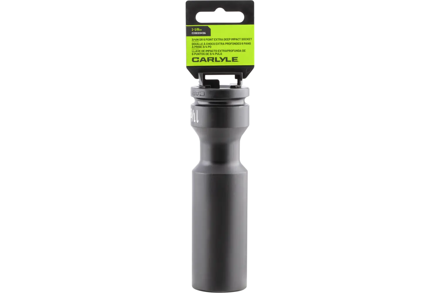 The Carlyle 3/4 in. Drive Extra Deep Impact Socket is a durable and versatile tool for professionals and DIYers. Made from chrome molybdenum alloy steel, this socket is built to handle tough jobs with precision. Its radius corner design grips fasteners securely and reduces wear, while chamfered openings allow for quick and easy placement. With its extra-deep design, this socket is ideal for a variety of applications, making it a reliable choice for challenging tasks.