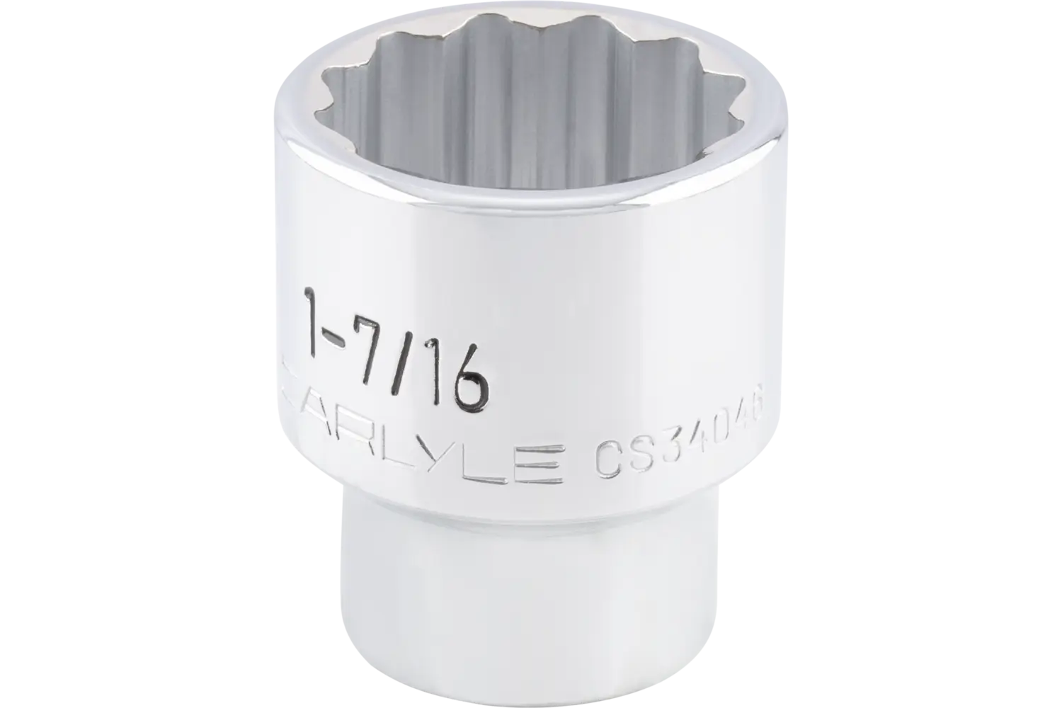 The Carlyle 3/4 in. Drive Standard Depth Chrome Socket is a reliable tool for tackling a wide range of tasks. Forged from chrome vanadium alloy steel, this socket is designed for strength and durability. Its 12-point radius corner design reduces wear and improves grip on fasteners, while the polished chrome finish resists rust and corrosion. Deep-rolled markings make size identification quick and easy. Whether you're a professional or a DIYer, this socket is a dependable addition to your toolbox, ready to handle tough tasks in the shop or garage.