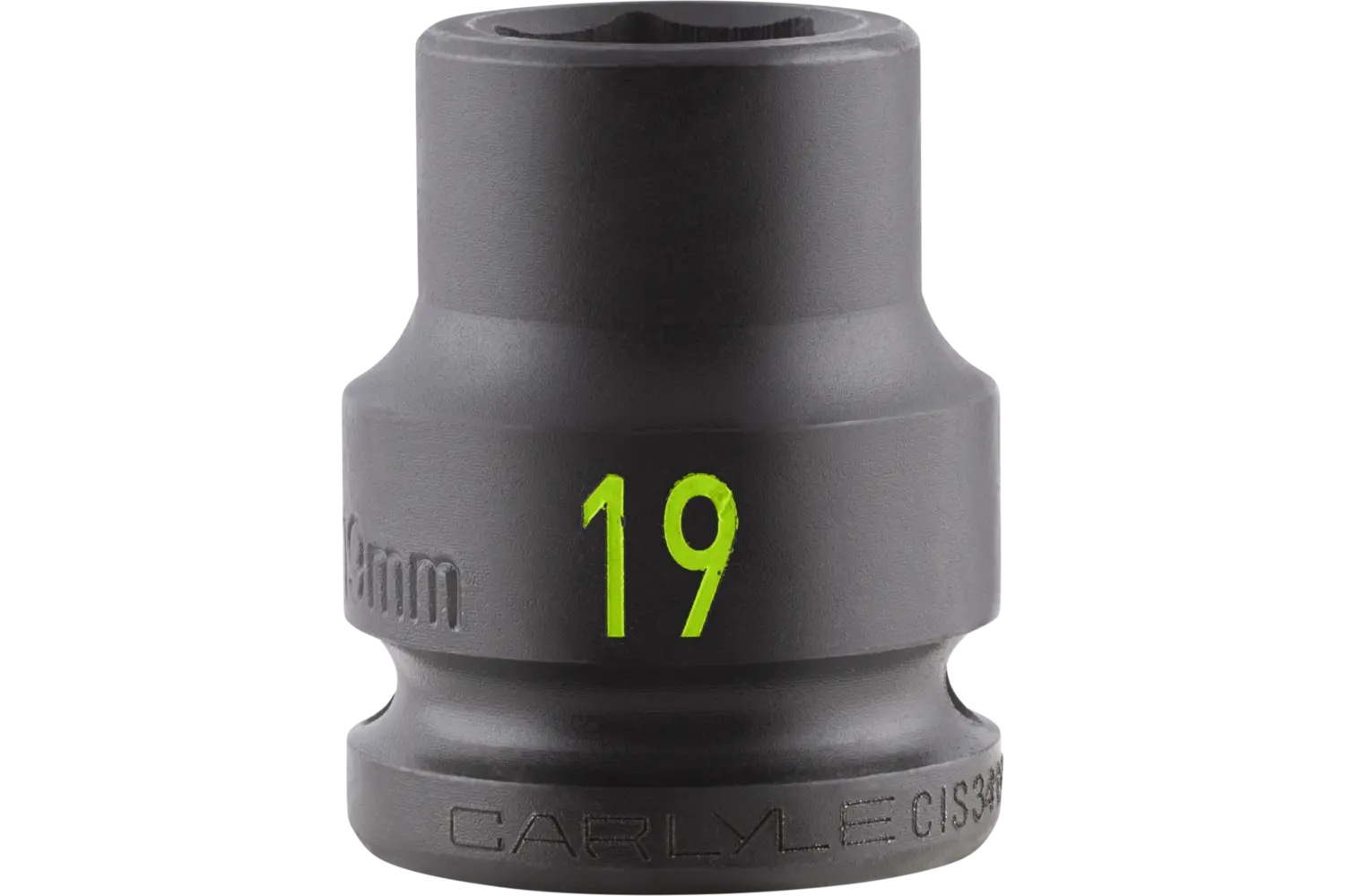 The Carlyle 3/4 in. Drive Standard Depth Impact Socket is a durable tool designed for demanding tasks. Forged from chrome molybdenum alloy steel, this socket is built to handle tough jobs with ease. The radius corner design provides a secure grip on fasteners, reducing wear and rounding, while chamfered openings allow for quick and precise placement. With deep-rolled markings for easy identification, this socket is a practical addition to any toolkit for automotive and industrial applications.