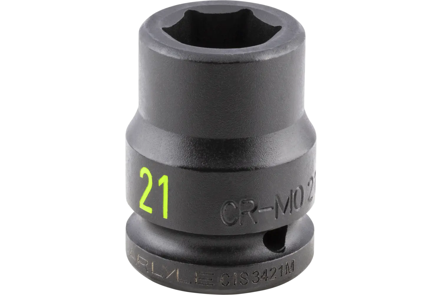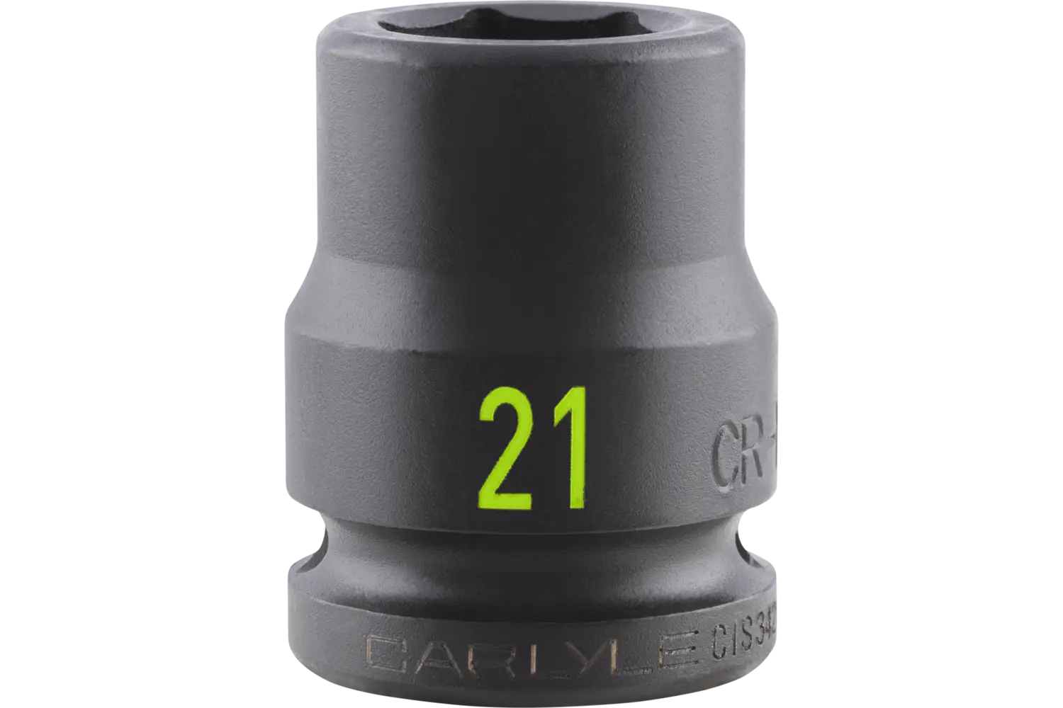 The Carlyle 3/4 in. Drive Standard Depth Impact Socket is a durable tool designed for demanding tasks. Forged from chrome molybdenum alloy steel, this socket is built to handle tough jobs with ease. The radius corner design provides a secure grip on fasteners, reducing wear and rounding, while chamfered openings allow for quick and precise placement. With deep-rolled markings for easy identification, this socket is a practical addition to any toolkit for automotive and industrial applications.