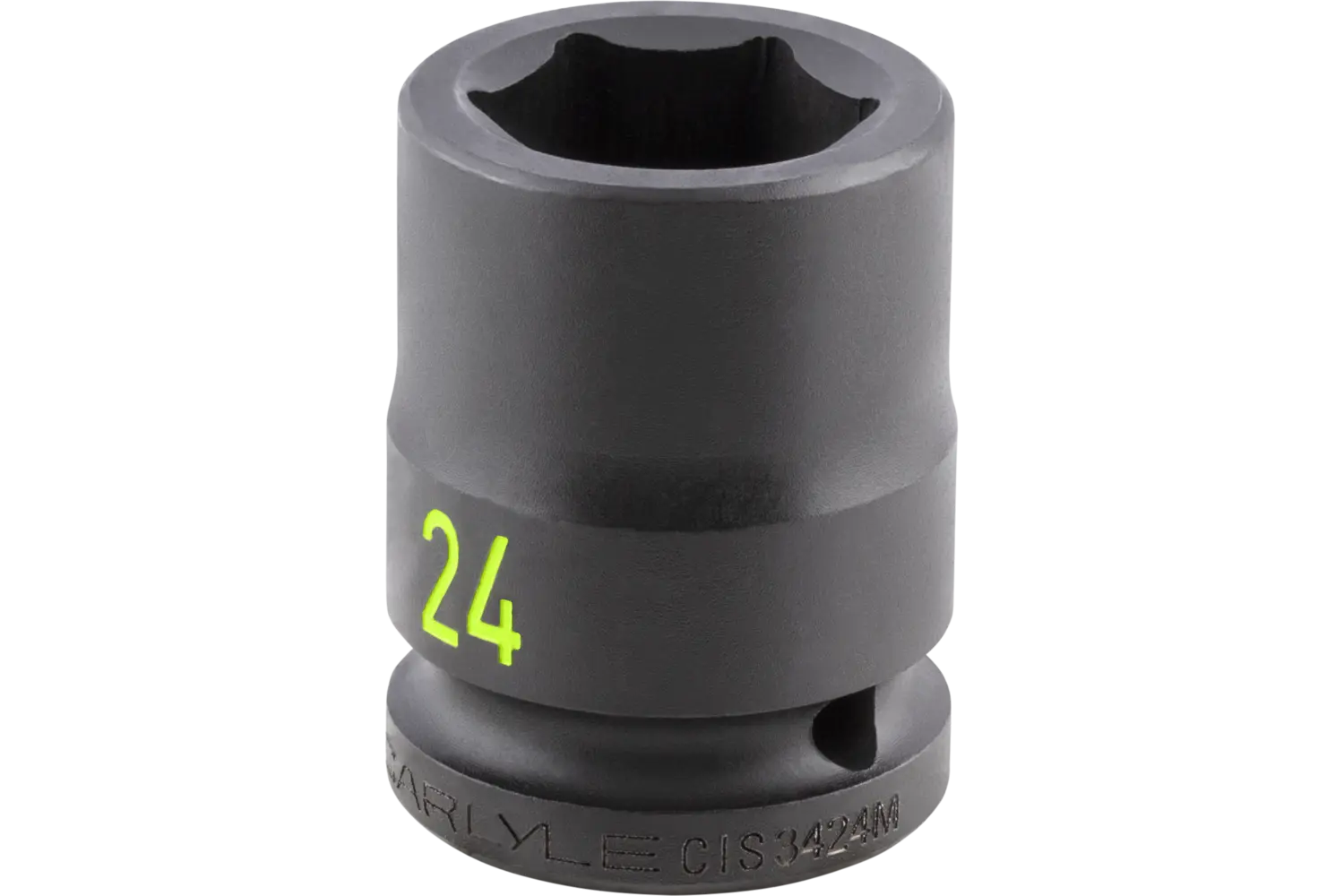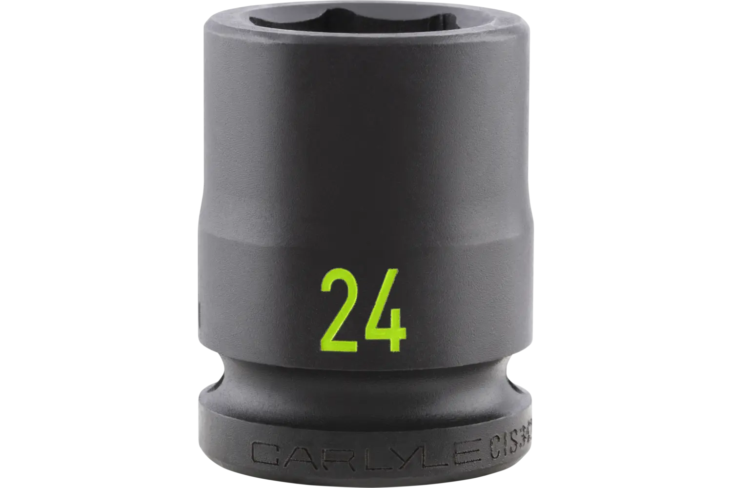 The Carlyle 3/4 in. Drive Standard Depth Impact Socket is a durable tool designed for demanding tasks. Forged from chrome molybdenum alloy steel, this socket is built to handle tough jobs with ease. The radius corner design provides a secure grip on fasteners, reducing wear and rounding, while chamfered openings allow for quick and precise placement. With deep-rolled markings for easy identification, this socket is a practical addition to any toolkit for automotive and industrial applications.