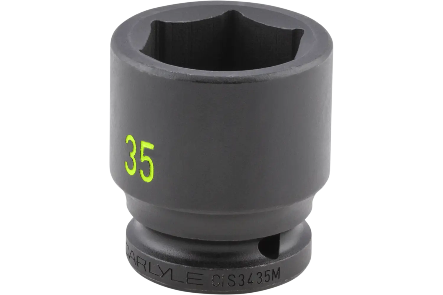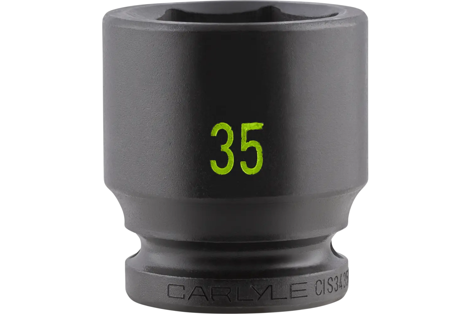 The Carlyle 3/4 in. Drive Standard Depth Impact Socket is a durable tool designed for demanding tasks. Forged from chrome molybdenum alloy steel, this socket is built to handle tough jobs with ease. The radius corner design provides a secure grip on fasteners, reducing wear and rounding, while chamfered openings allow for quick and precise placement. With deep-rolled markings for easy identification, this socket is a practical addition to any toolkit for automotive and industrial applications.