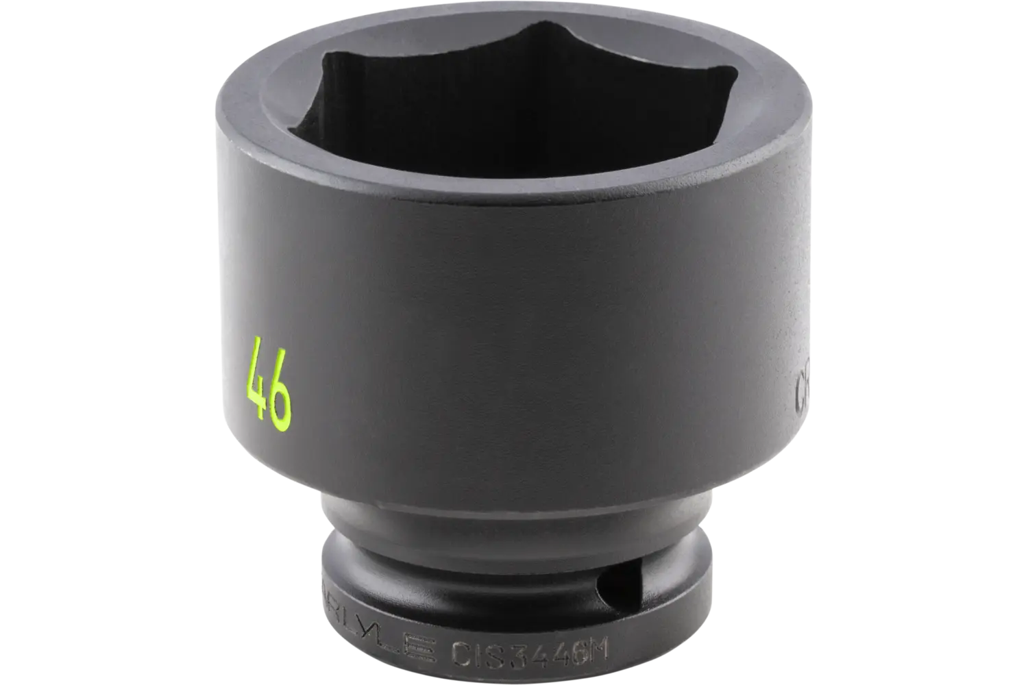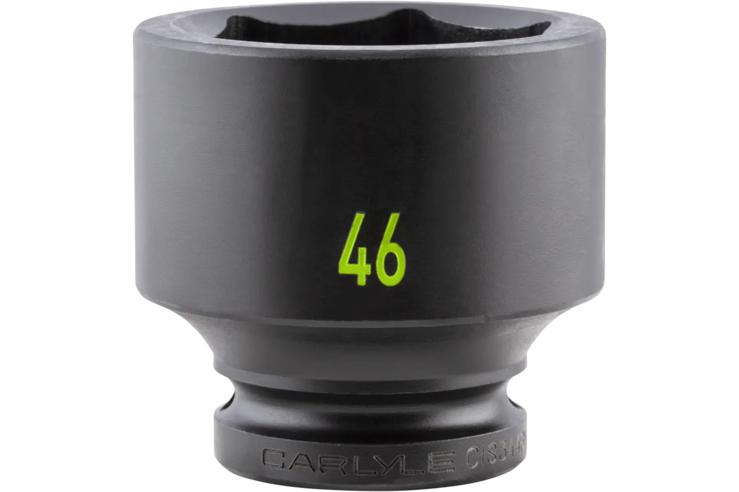 The Carlyle 3/4 in. Drive Standard Depth Impact Socket is a durable tool designed for demanding tasks. Forged from chrome molybdenum alloy steel, this socket is built to handle tough jobs with ease. The radius corner design provides a secure grip on fasteners, reducing wear and rounding, while chamfered openings allow for quick and precise placement. With deep-rolled markings for easy identification, this socket is a practical addition to any toolkit for automotive and industrial applications.