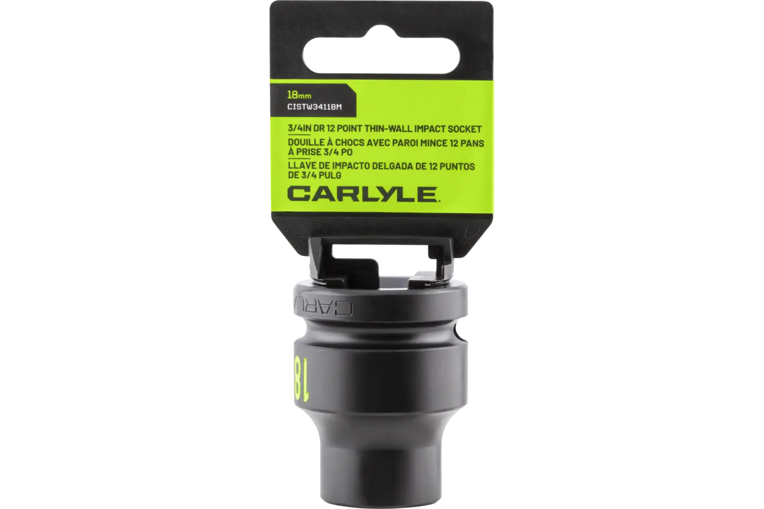 The Carlyle 3/4 in. Drive Thin-Wall Standard Depth Impact Socket is a durable tool designed for professionals and DIYers alike. Forged from chrome molybdenum alloy steel, this socket is built for strength and precision. The radius corner design provides a better grip on fasteners, helping to reduce wear and rounding. Chamfered openings make placement faster and easier, saving time on the job. With its thin-wall construction, this socket is ideal for accessing tight spaces while maintaining durability. A great addition to any toolkit, this socket is ready to handle challenging tasks.