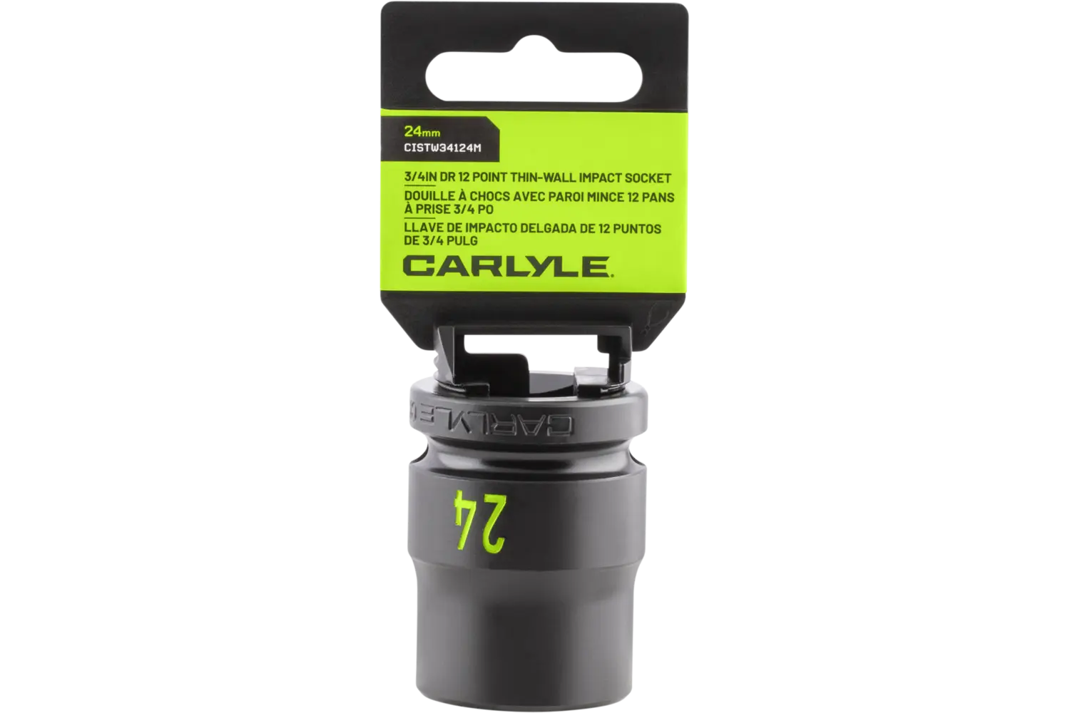 The Carlyle 3/4 in. Drive Thin-Wall Standard Depth Impact Socket is a durable tool designed for professionals and DIYers alike. Forged from chrome molybdenum alloy steel, this socket is built for strength and precision. The radius corner design provides a better grip on fasteners, helping to reduce wear and rounding. Chamfered openings make placement faster and easier, saving time on the job. With its thin-wall construction, this socket is ideal for accessing tight spaces while maintaining durability. A great addition to any toolkit, this socket is ready to handle challenging tasks.
