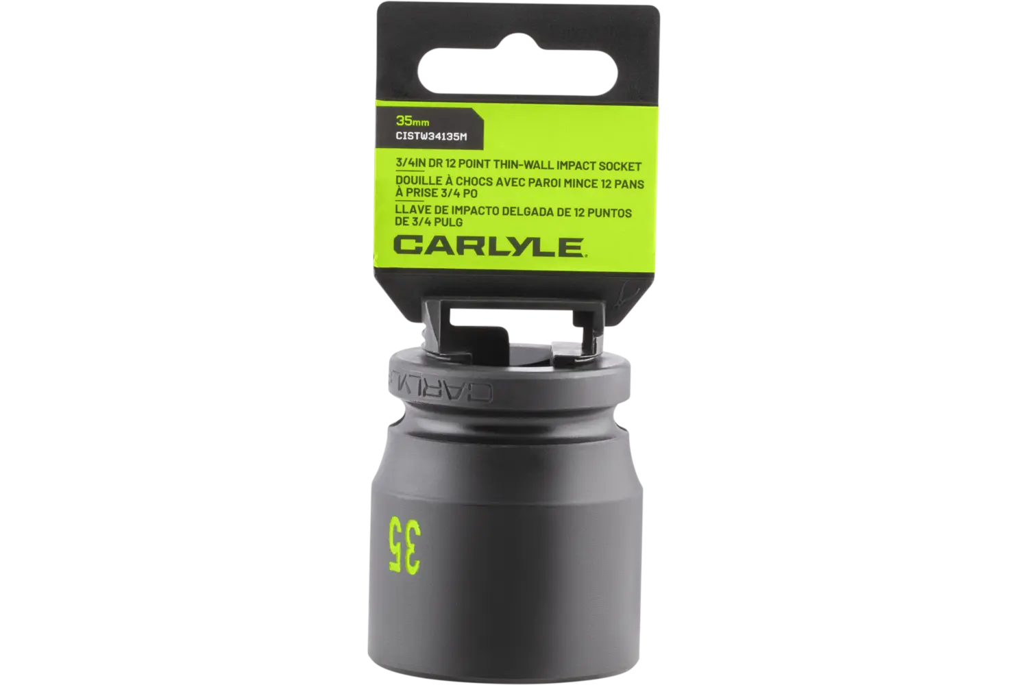The Carlyle 3/4 in. Drive Thin-Wall Standard Depth Impact Socket is a durable tool designed for professionals and DIYers alike. Forged from chrome molybdenum alloy steel, this socket is built for strength and precision. The radius corner design provides a better grip on fasteners, helping to reduce wear and rounding. Chamfered openings make placement faster and easier, saving time on the job. With its thin-wall construction, this socket is ideal for accessing tight spaces while maintaining durability. A great addition to any toolkit, this socket is ready to handle challenging tasks.