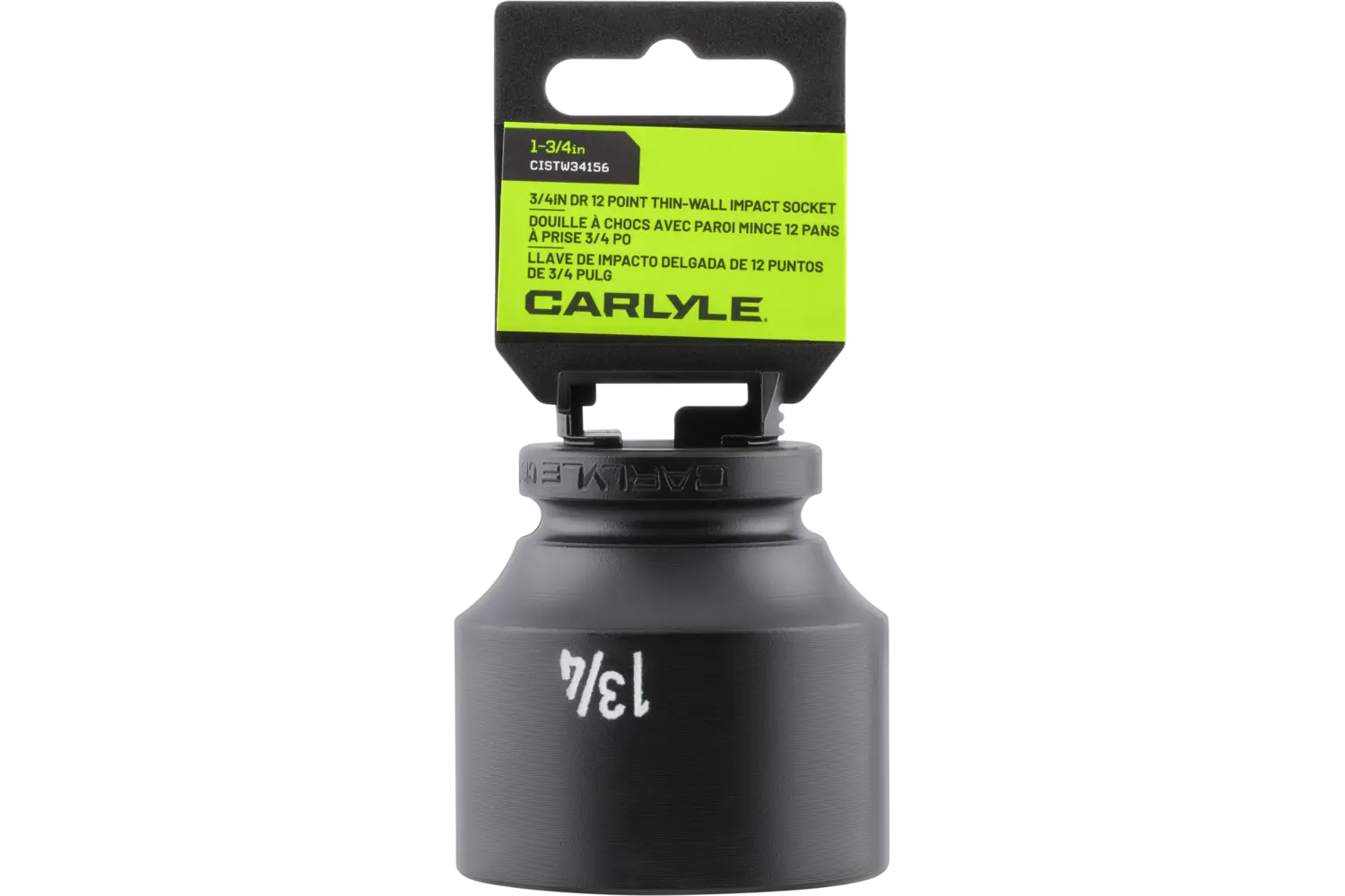 The Carlyle 3/4 in. Drive Thin-Wall Standard Depth Impact Socket is a versatile tool for automotive professionals and DIYers. Crafted from chrome molybdenum alloy steel, this socket is built to handle tough jobs with precision. Its radius corner design improves torque and reduces wear, while the chamfered openings make placement quick and easy. The thin-wall construction allows access to tight spaces, making it a practical choice for a variety of applications. Whether you're in the shop or the garage, this impact socket is a reliable tool for demanding tasks.