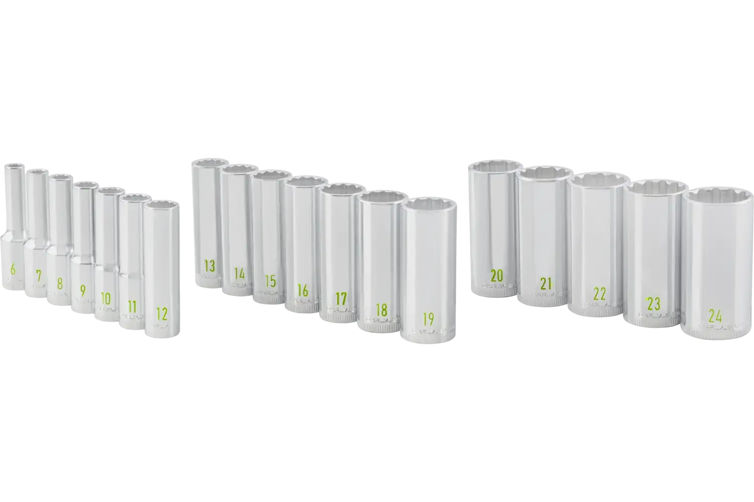6mm, 7mm, 8mm, 9mm, 10mm, 11mm, 12mm, 13mm, 14mm, 15mm, 16mm, 17mm, 18mm, 19mm, 20mm, 21mm, 22mm, 23mm, 24mm Chrome 12 Point Deep 19 PC EVA Foam