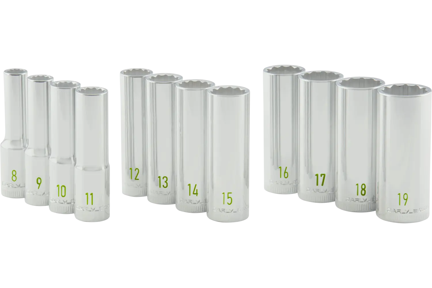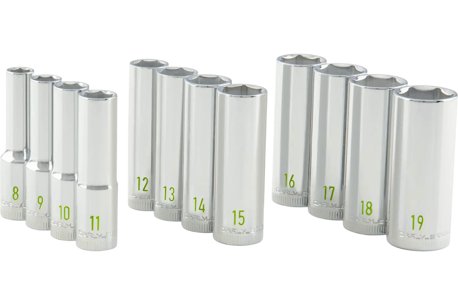 Built to deliver reliability under extreme working conditions, the Carlyle 3/8 in. Drive Deep Chrome Socket Set - Metric is made for pros and DIYers alike. Each socket features either a 6-point or 12-point design, ensuring superior fastener engagement and torque distribution. Its highly polished chrome-plated finish resists rust and keeps the sockets looking great job after job. Available in sets with 12 or 19 pieces, this socket set comes with a socket rail for easy organization and access. Engineered for heavy-duty use, this set is perfect for tackling complex tasks in the shop or on the road.