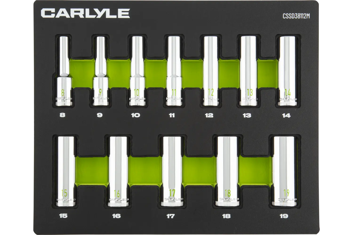 8mm, 9mm, 10mm, 11mm, 12mm, 13mm, 14mm, 15mm, 16mm, 17mm, 18mm, 19mm Chrome 12 Point Deep 12 PC EVA Foam