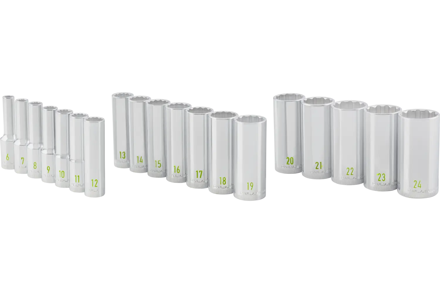 6mm, 7mm, 8mm, 9mm, 10mm, 11mm, 12mm, 13mm, 14mm, 15mm, 16mm, 17mm, 18mm, 19mm, 20mm, 21mm, 22mm, 23mm, 24mm Chrome 6 Point Deep 19 PC EVA Foam