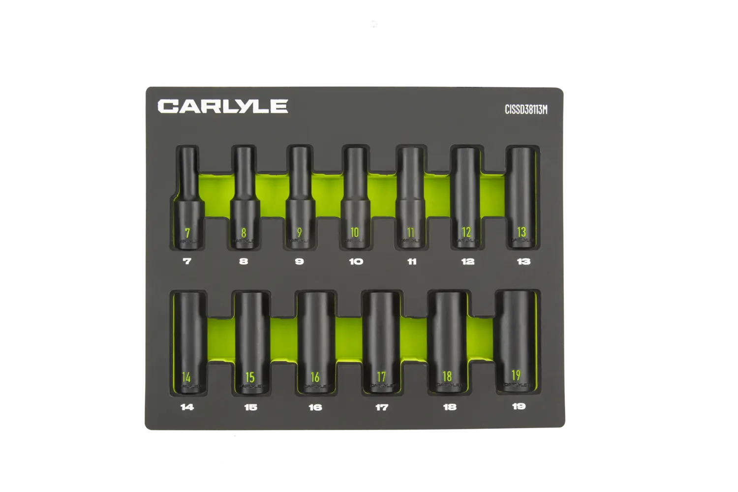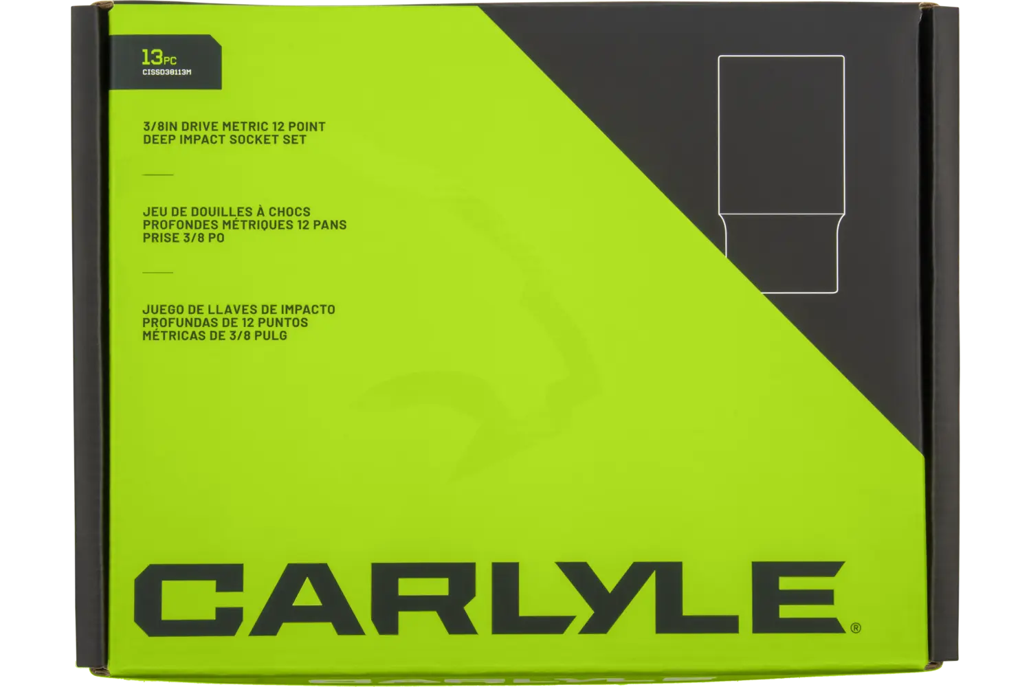 The Carlyle 3/8 in. Drive Deep Impact Socket Set - Metric is engineered for strength and versatility, making it a reliable tool for demanding jobs. Crafted from chrome molybdenum alloy steel, this set delivers exceptional durability and performance. The radius corner design offers a secure grip on fasteners, reducing wear and maximizing torque. Chamfered openings allow for quick and seamless connections, while the set is available in 12-point or 6-point configurations. Complete with a blow mold case or storage tray, this set is ideal for professionals and DIY enthusiasts who need dependable tools for tough tasks.