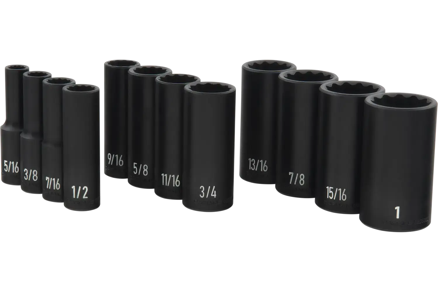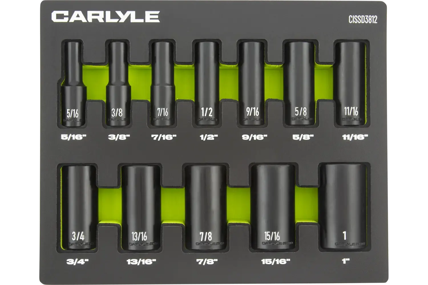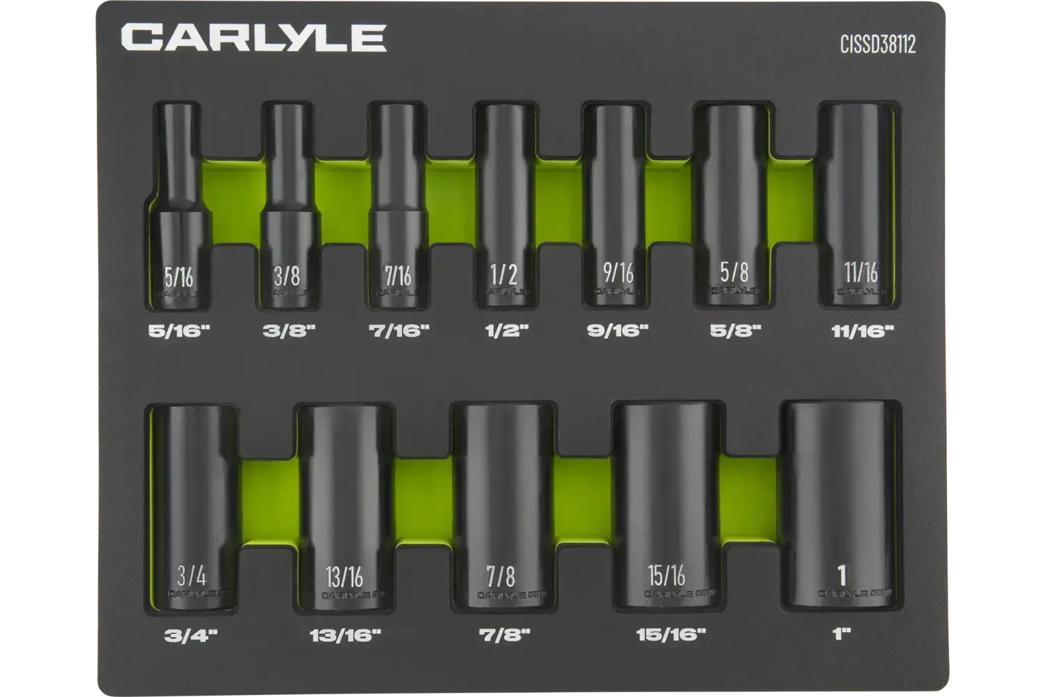 5/16in, 3/8in, 7/16in, 1/2in, 9/16in, 5/8in, 11/16in, 3/4in, 13/16in, 7/8in, 15/16in, 1in Magnesium Phosphate 6 Point Deep 12 PC EVA Foam
