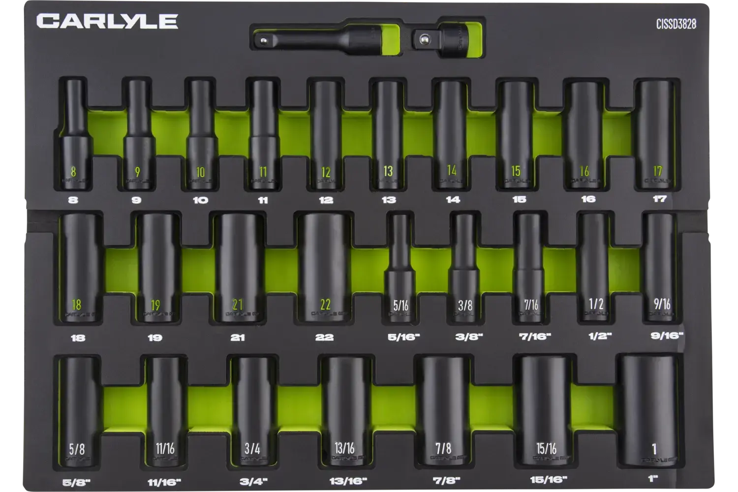 5/16in, 3/8in, 7/16in, 1/2in, 9/16in, 5/8in, 11/16in, 3/4in, 13/16in, 7/8in, 15/16in, 1in, 8mm, 9mm, 10mm, 11mm, 12mm, 13mm, 14mm, 15mm, 16mm, 17mm, 18mm, 19mm, 21mm, 22mm, 3/8in F x 1/2in M, 3in Length Magnesium Phosphate 6 Point Deep 28 PC EVA Foam