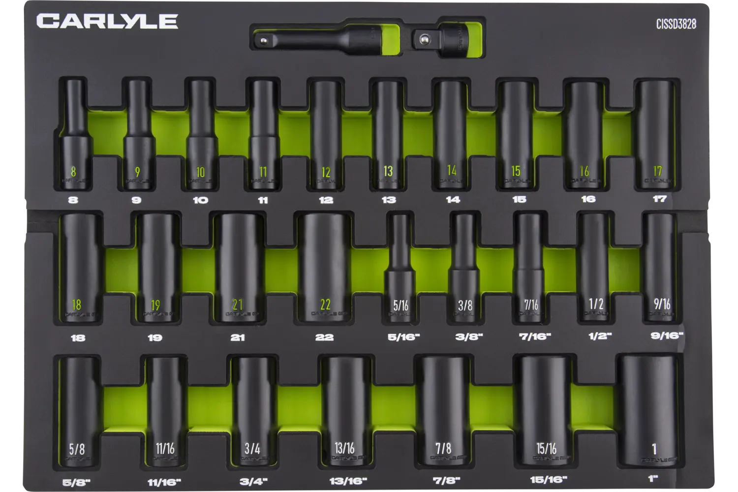 The Carlyle 3/8 in. Drive Deep Impact Socket Set - SAE is built for durability and precision, making it an essential addition to any toolkit. Forged from chrome molybdenum alloy steel, this set is designed to withstand heavy-duty use while delivering consistent performance. The radius corner design offers maximum torque and reduces wear on fasteners, while chamfered openings allow for quick and easy connections. Available in 12-point or 6-point configurations, this set offers multiple size options and includes a blow mold case or storage tray for convenient organization. Designed for professionals and DIYers, this set is built to handle demanding tasks with confidence.