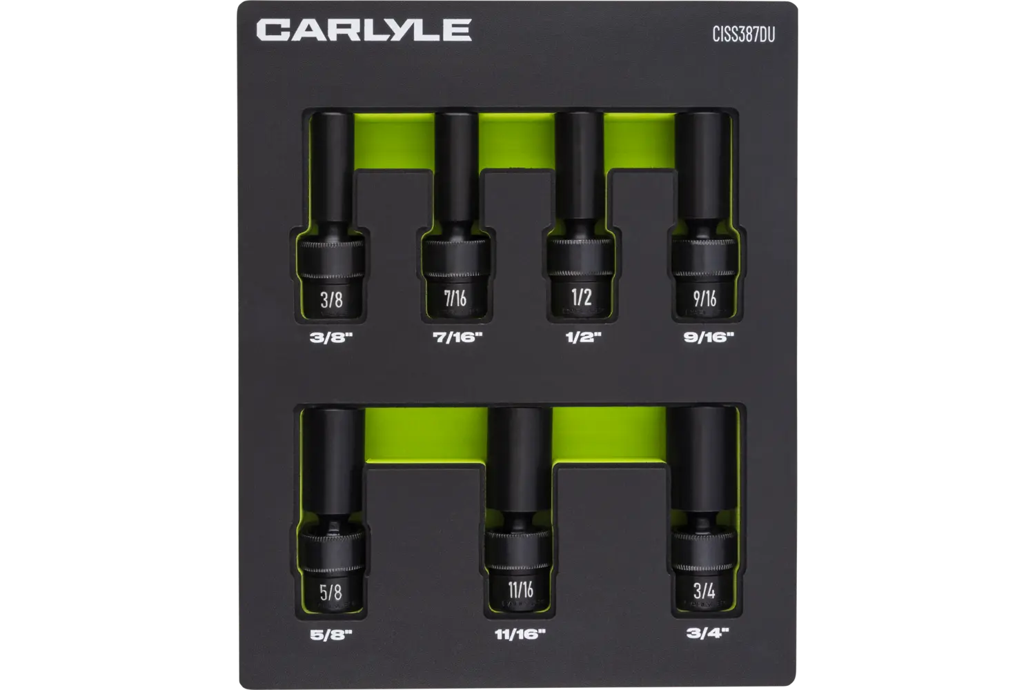 | 3/8in, 7/16in, 1/2in, 9/16in, 5/8in, 11/16in, 3/4in | Magnesium Phosphate | 6 Point | Deep | 7 PC | EVA Foam |