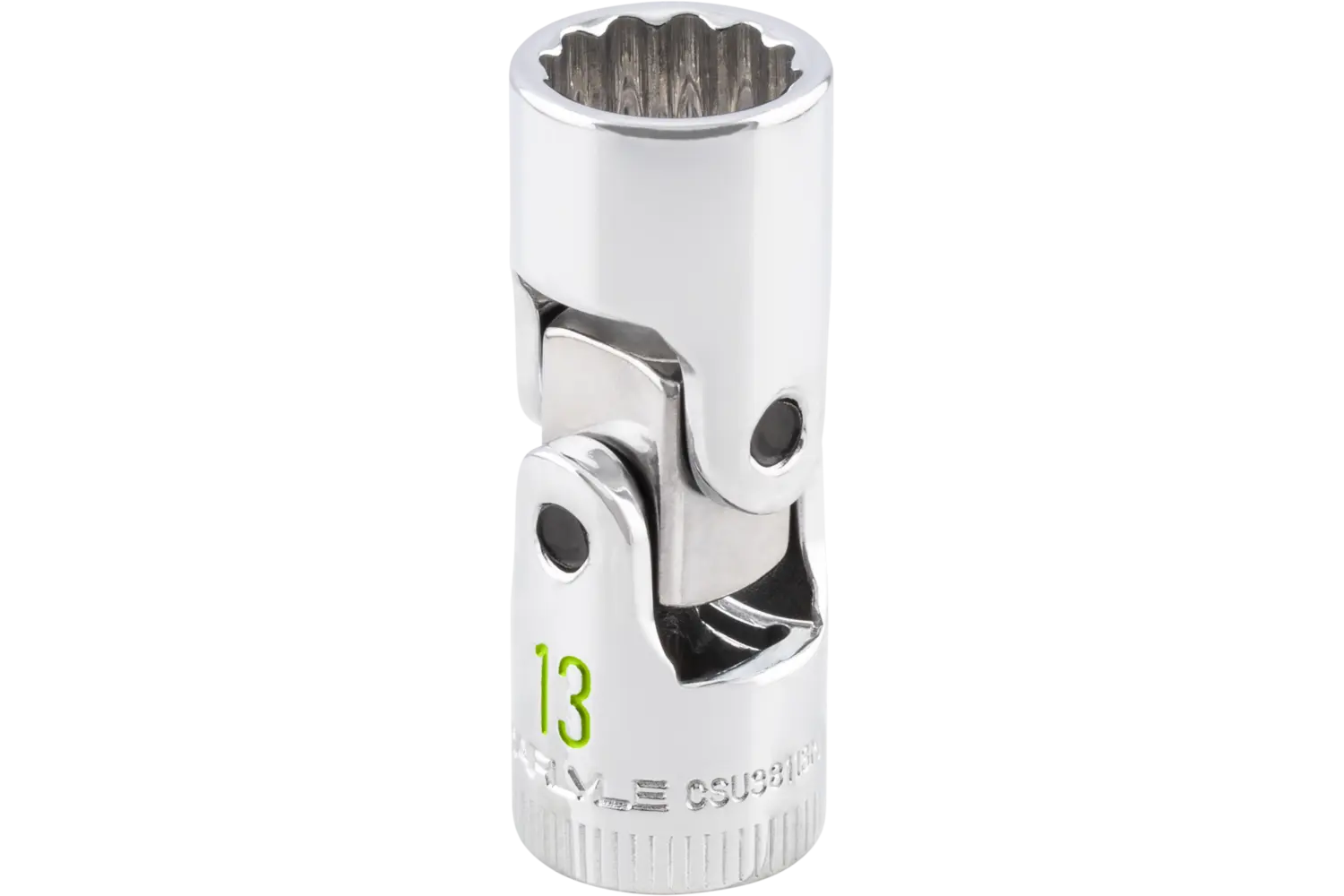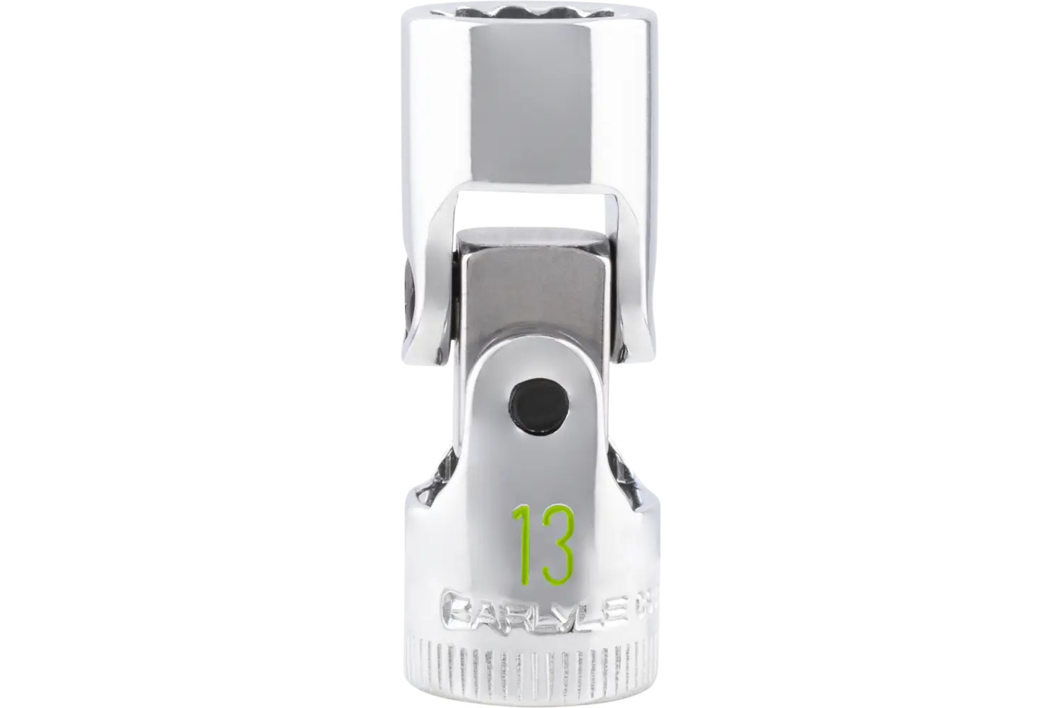 The Carlyle 3/8 in. Drive Flex Impact Socket - Metric is a versatile tool for tackling fasteners in hard-to-reach areas. Equipped with a universal joint for enhanced flexibility, it maneuvers easily into tight spaces. The 6-point or 12-point design reduces bolt and nut wear while improving grip. The polished chrome-plated finish resists rust, providing durability and long-lasting performance for demanding tasks.